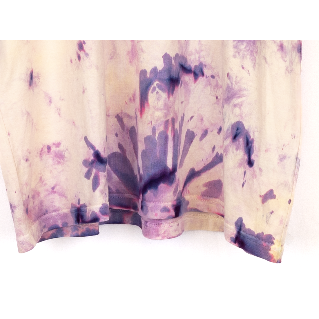 ”染め”表現を独自のフィルターで研究し、掘り下げている畑野さんにお願いしたタイダイTシャツ。希少な蛍光イエローの染料を使用し、最初に薄い膜をはるようなイメージで染めてもらい、そこから薄く色を5〜7層と重ねていき1点1点違った表現、方法で染色し製作。生地、染める時間、絞りの強さ、染料同士の相性、色の出し方など様々な要素から色、柄がつくり出されていきる。ボディはこのTシャツを製作するために、事前に染料の入り方、着心地、染め後のシルエットのバランスを実験し製作したオリジナルのコットンボディを採用。