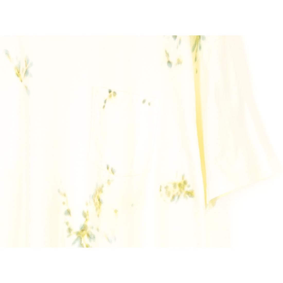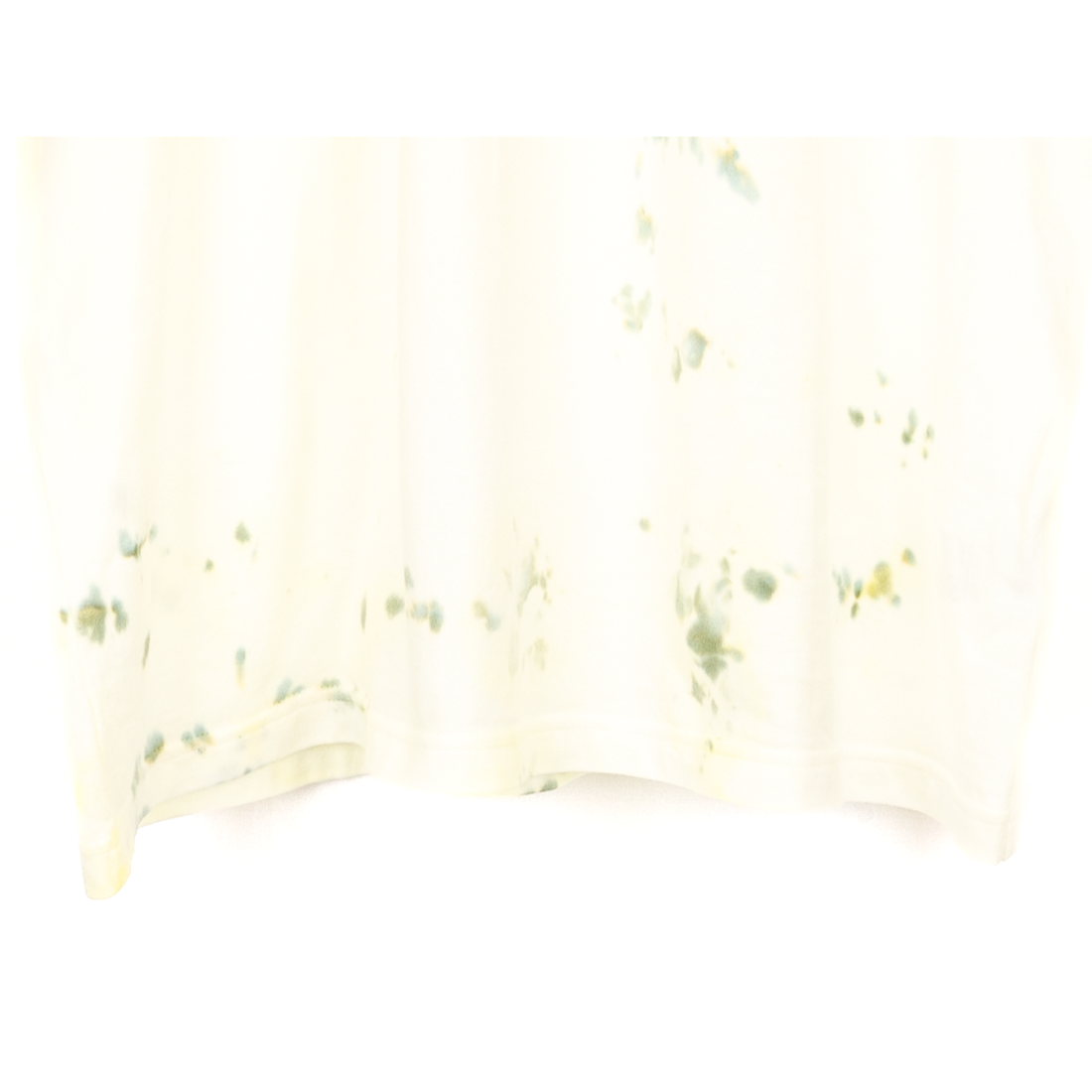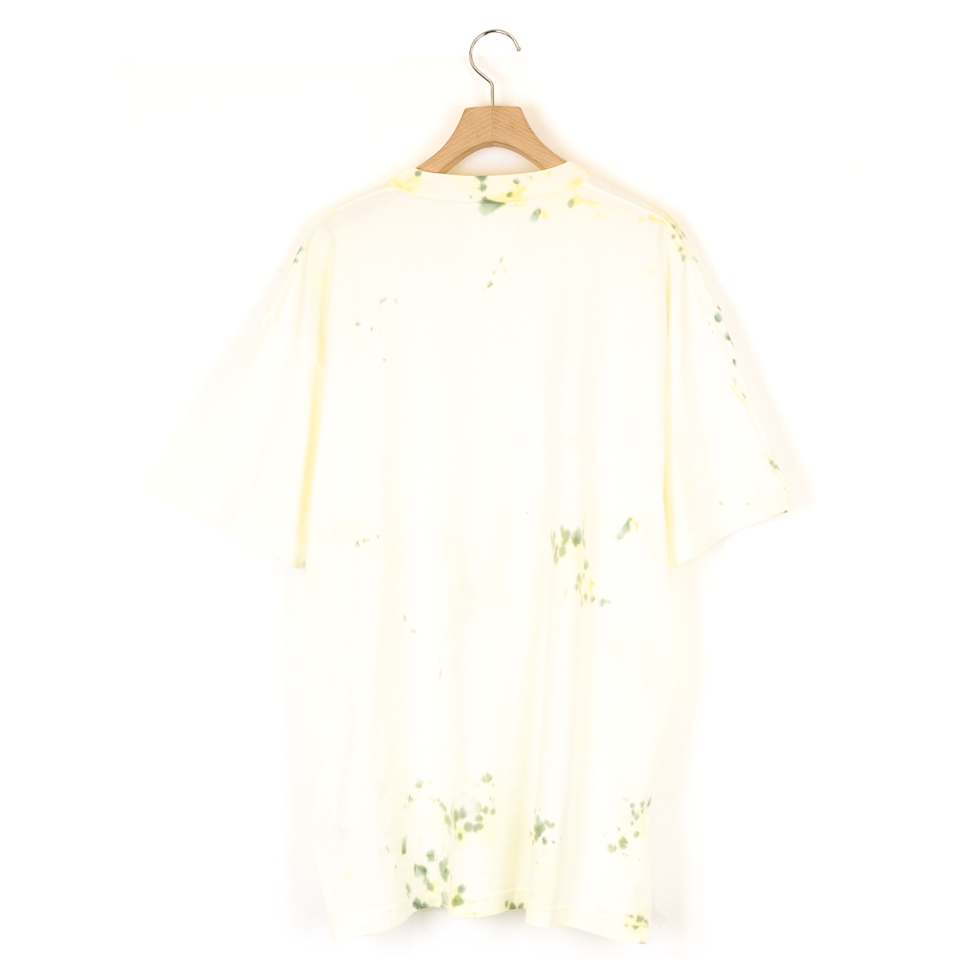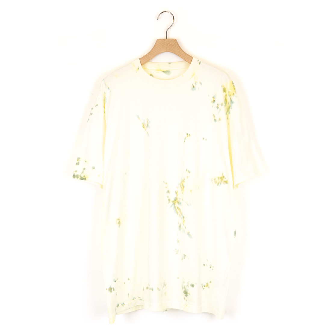 ”染め”表現を独自のフィルターで研究し、掘り下げている畑野さんにお願いしたタイダイTシャツ。希少な蛍光イエローの染料を使用し、最初に薄い膜をはるようなイメージで染めてもらい、そこから薄く色を5〜7層と重ねていき1点1点違った表現、方法で染色し製作。生地、染める時間、絞りの強さ、染料同士の相性、色の出し方など様々な要素から色、柄がつくり出されていきる。ボディはこのTシャツを製作するために、事前に染料の入り方、着心地、染め後のシルエットのバランスを実験し製作したオリジナルのコットンボディを採用。