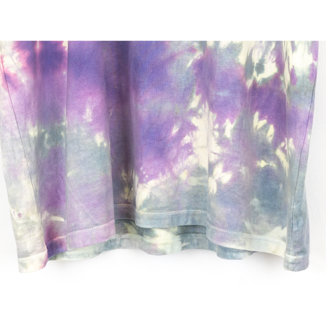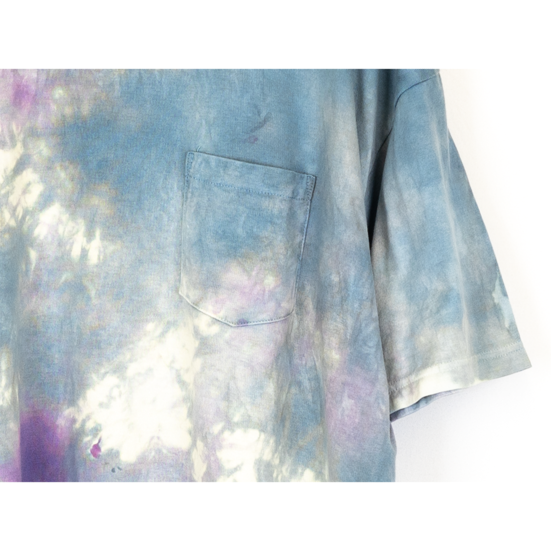 ”染め”表現を独自のフィルターで研究し、掘り下げている畑野さんにお願いしたタイダイTシャツ。希少な蛍光イエローの染料を使用し、最初に薄い膜をはるようなイメージで染めてもらい、そこから薄く色を5〜7層と重ねていき1点1点違った表現、方法で染色し製作。生地、染める時間、絞りの強さ、染料同士の相性、色の出し方など様々な要素から色、柄がつくり出されていきる。ボディはこのTシャツを製作するために、事前に染料の入り方、着心地、染め後のシルエットのバランスを実験し製作したオリジナルのコットンボディを採用。
