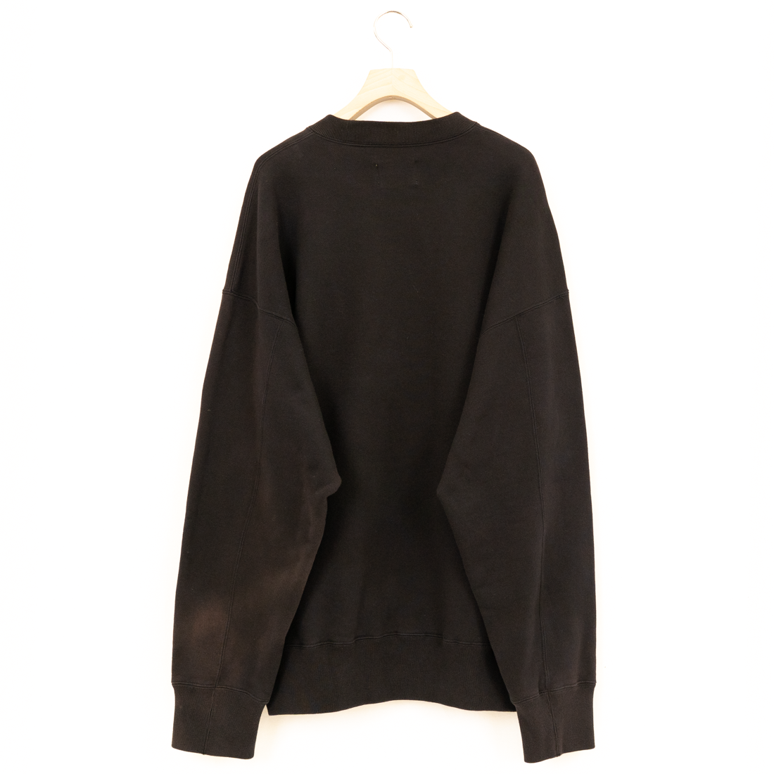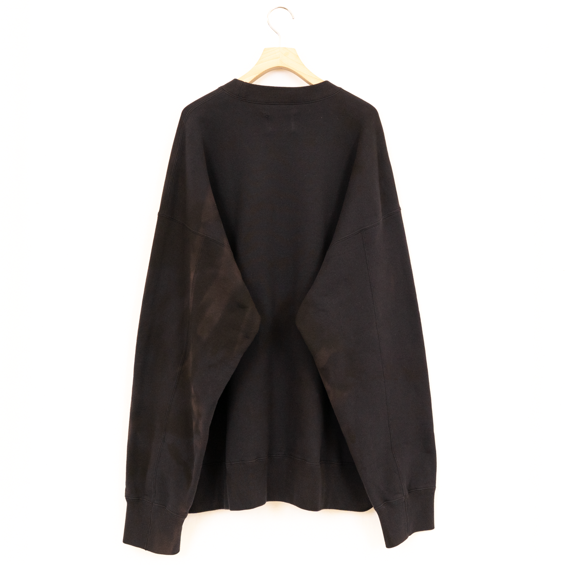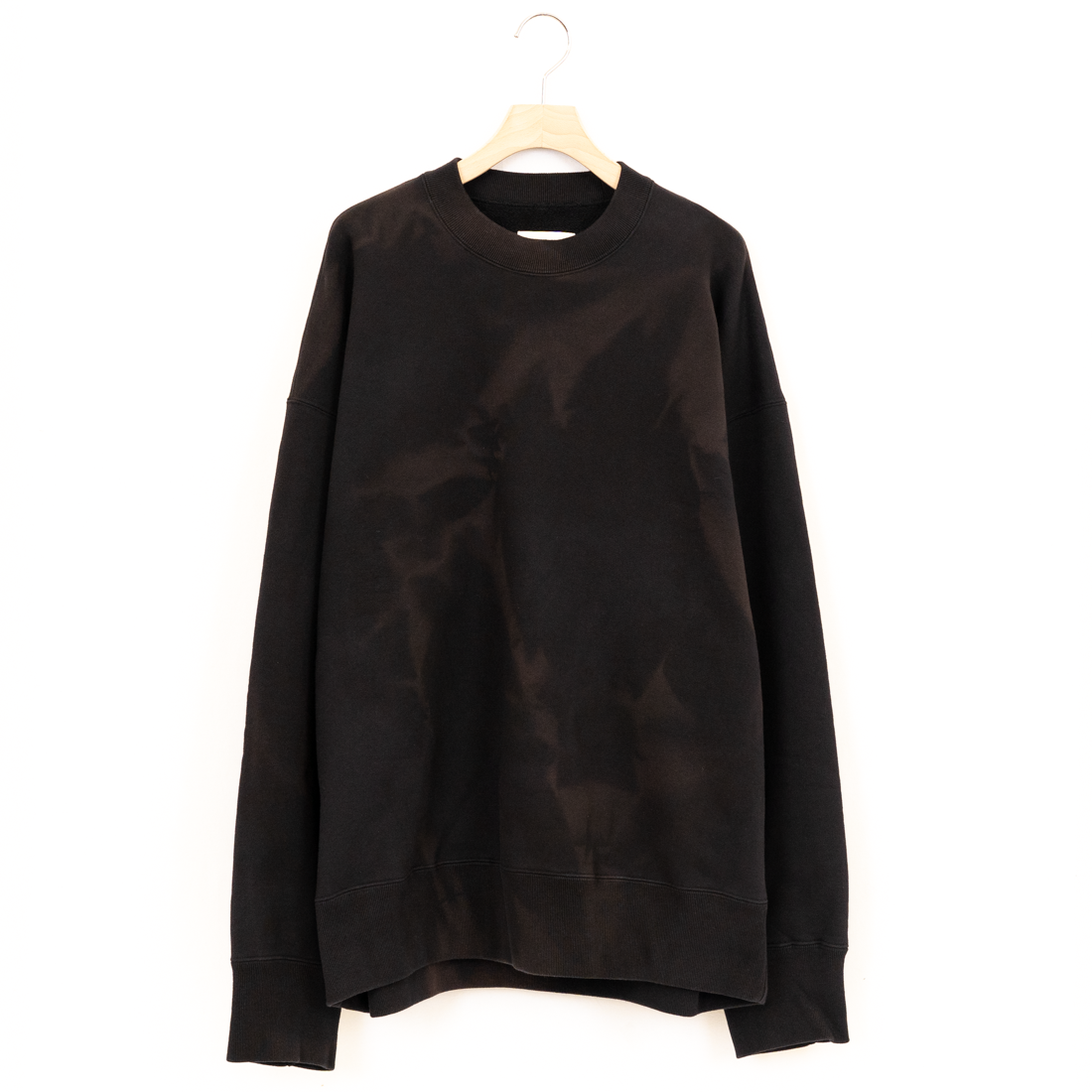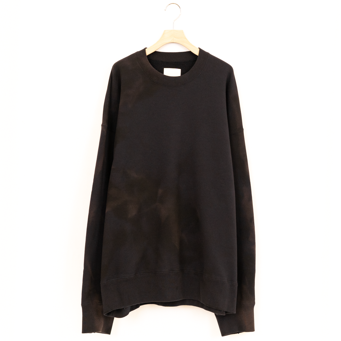 染め師畑野さんとの実験的な要素を多く含んだ継続的なプロジェクト。 今回はオリジナルのダークネイビーのスウェットボディに、太陽光で表面の色を抜く(やく)加工を施し、その上から黒の染料を吹きかけ、暗い宇宙のような奥行きのあるダークネイビーの色味を完成させた一着を製作。 沖縄まで赴き現地の太陽の光でスウェットを日焼けさせ、その後染料を1着ずつ吹きかけて製作。1点ずつ異なる日焼けの風合いと染料の入り方。ブリーチ材で色を抜いたコットンの風合いでは出せない、素材本来の柔らかい肌あたり、風合いを残したスウェット。
