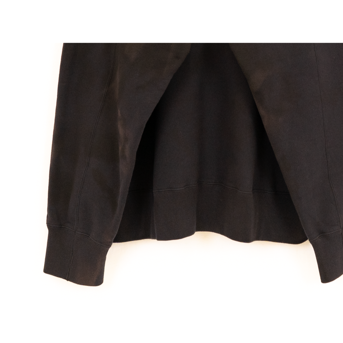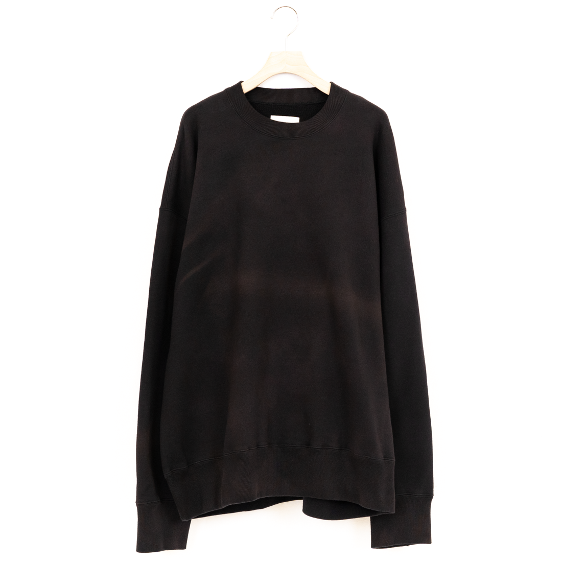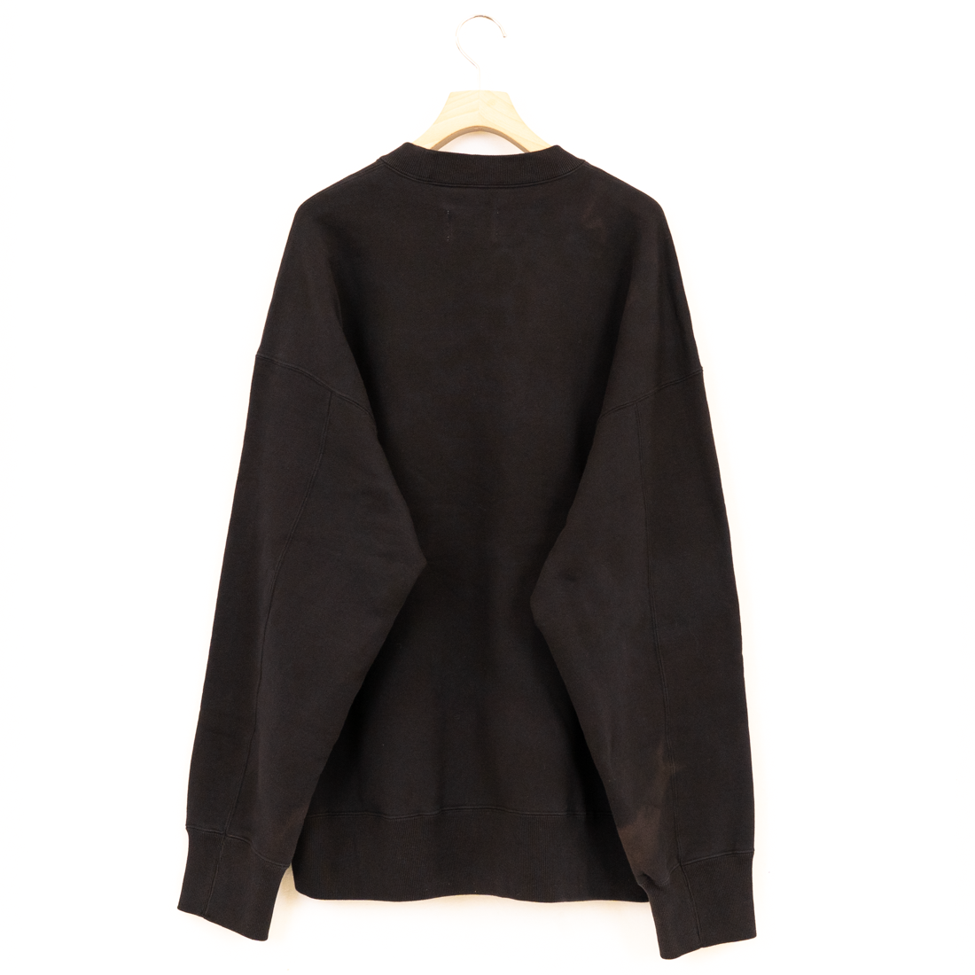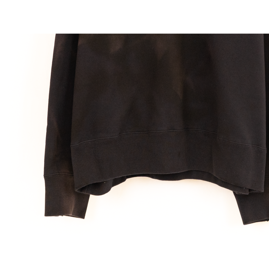 染め師畑野さんとの実験的な要素を多く含んだ継続的なプロジェクト。 今回はオリジナルのダークネイビーのスウェットボディに、太陽光で表面の色を抜く(やく)加工を施し、その上から黒の染料を吹きかけ、暗い宇宙のような奥行きのあるダークネイビーの色味を完成させた一着を製作。 沖縄まで赴き現地の太陽の光でスウェットを日焼けさせ、その後染料を1着ずつ吹きかけて製作。1点ずつ異なる日焼けの風合いと染料の入り方。ブリーチ材で色を抜いたコットンの風合いでは出せない、素材本来の柔らかい肌あたり、風合いを残したスウェット。