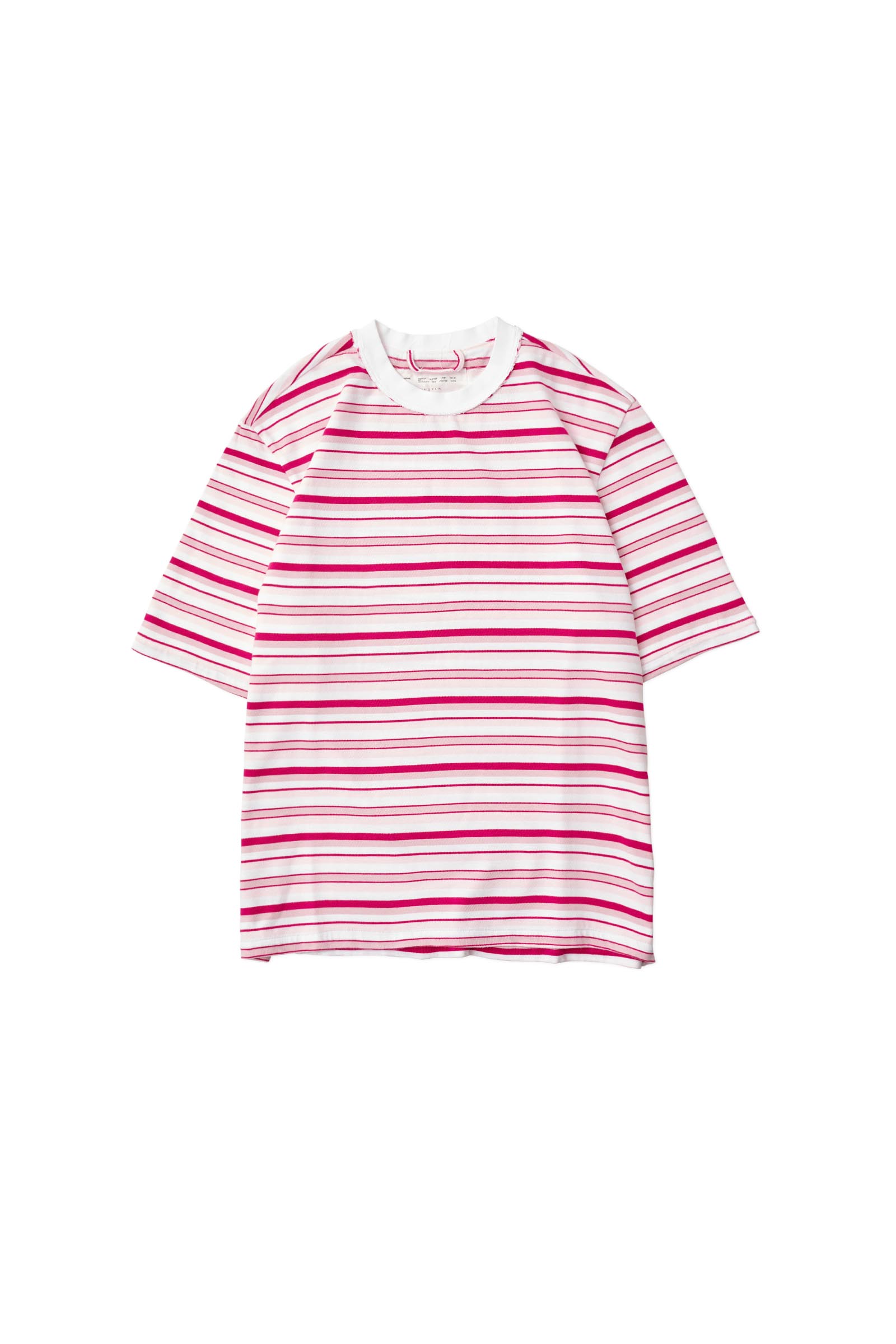 オーバーサイズのオリジナルのピンクストライプTシャツ。リブはジャージ素材。