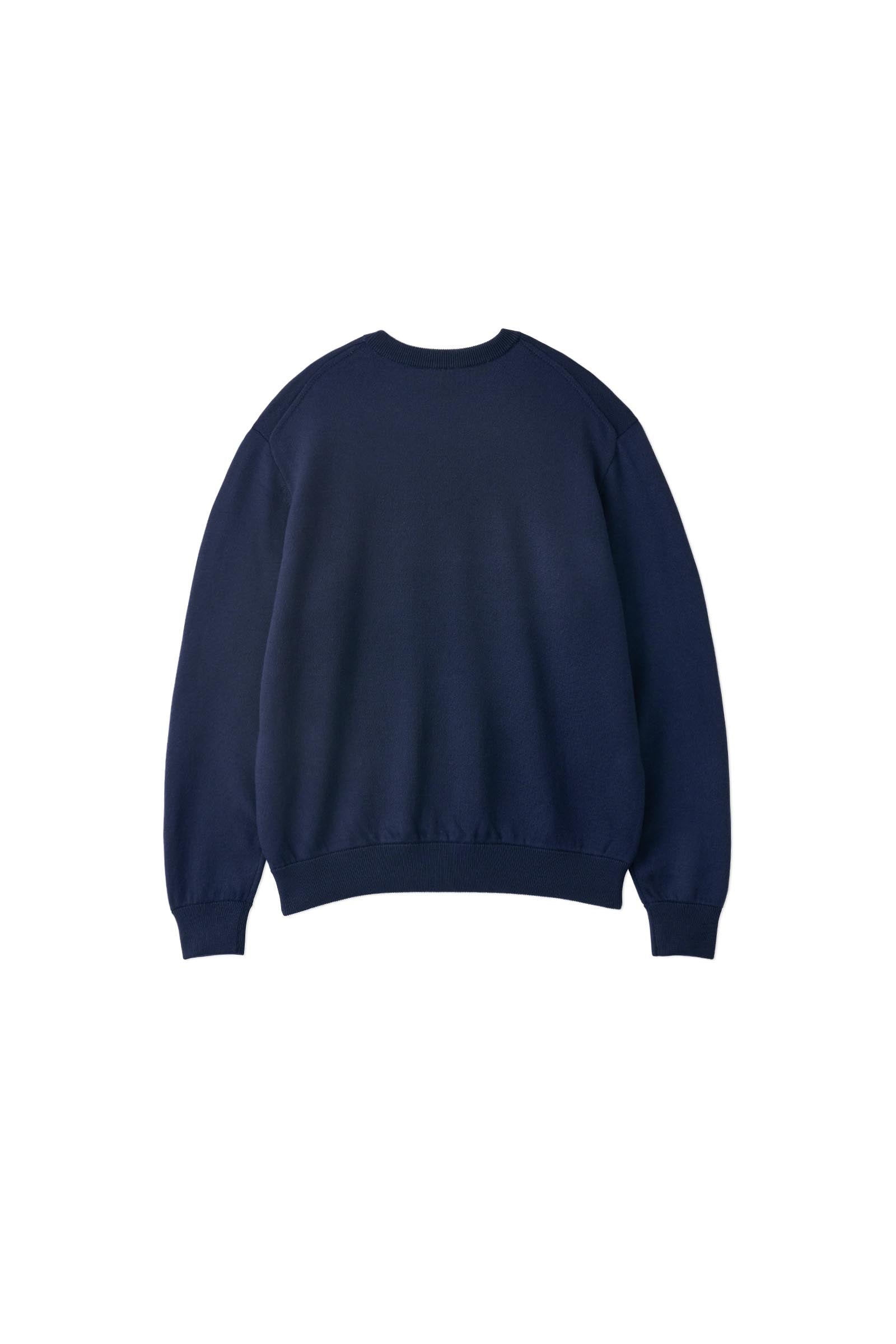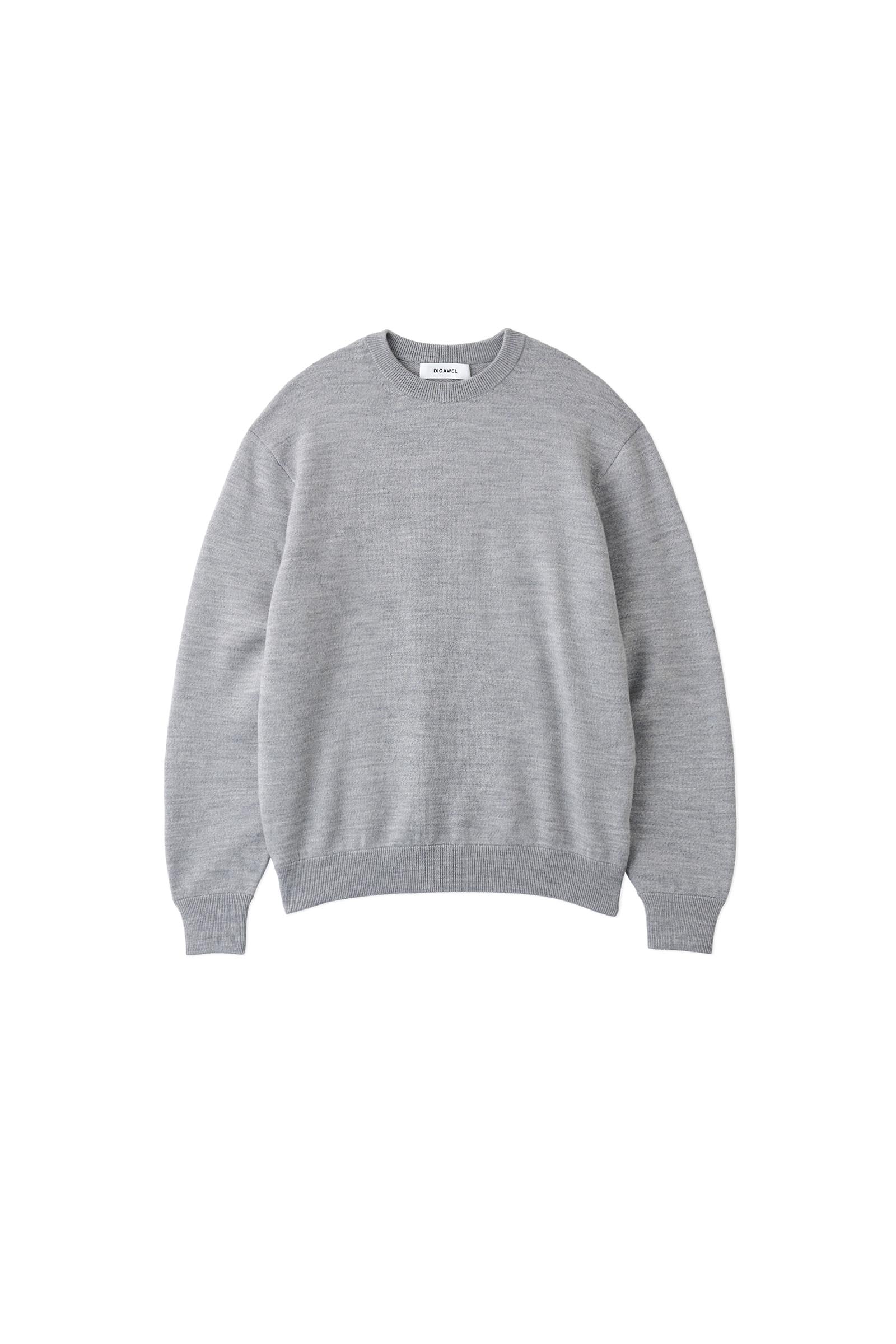 糸の本取りを表裏3本にし、ヘビー裏毛のような肉感を出し制作。糸自体も杢を使用してセーターでありながらスウェットのような表現をしている。 100% Basolan Extrafine Merino Wool ソフト防縮技術によるオフスケール加工後に紡績した糸の為、手洗いが可能。