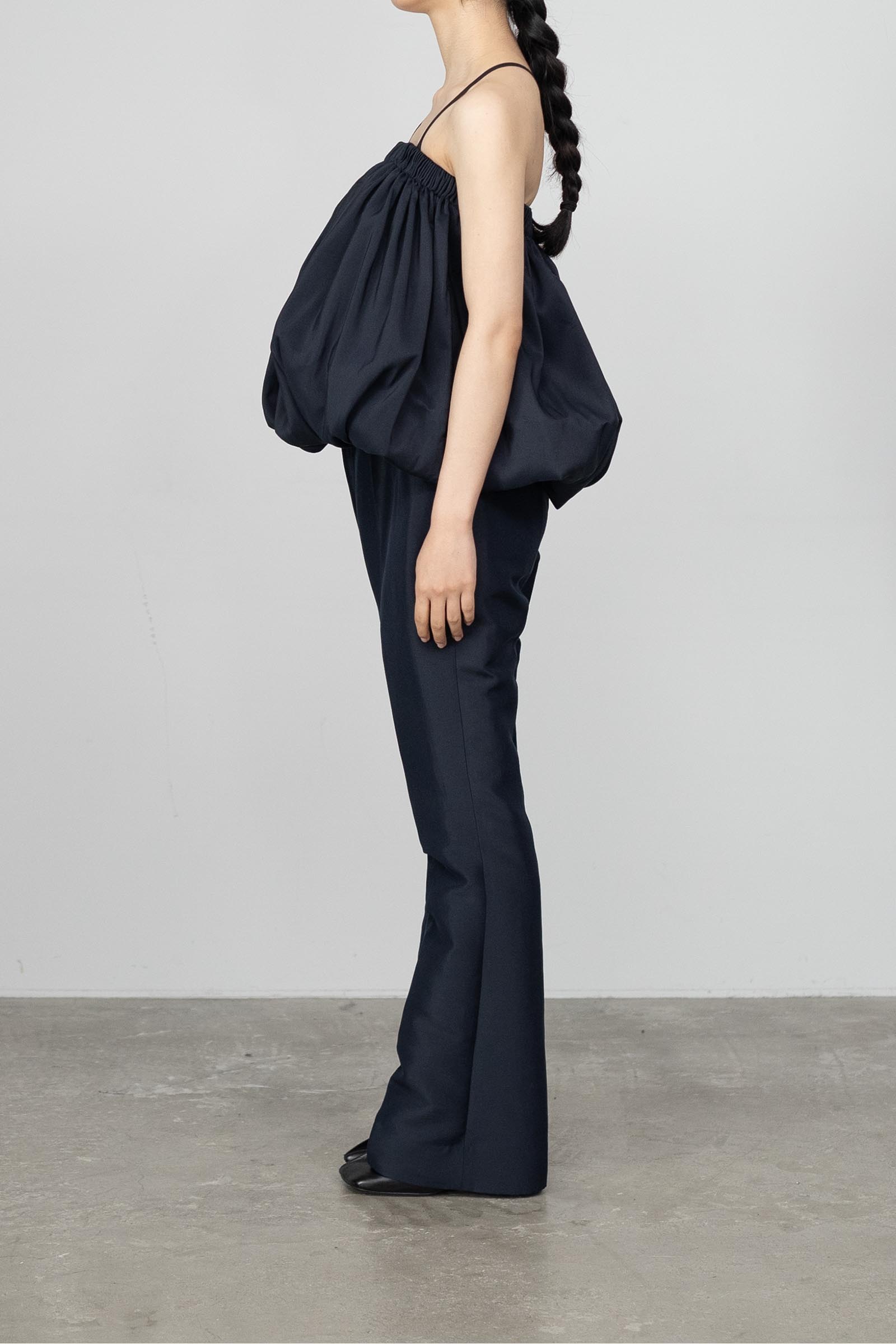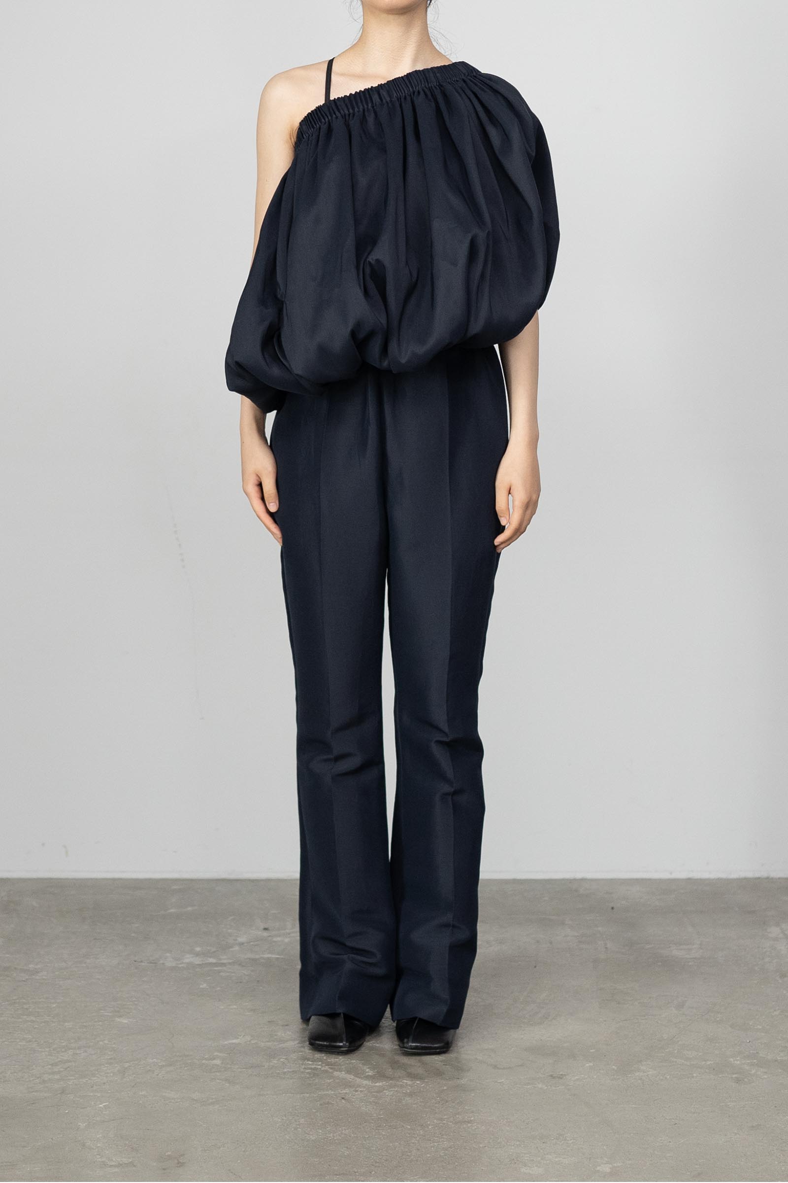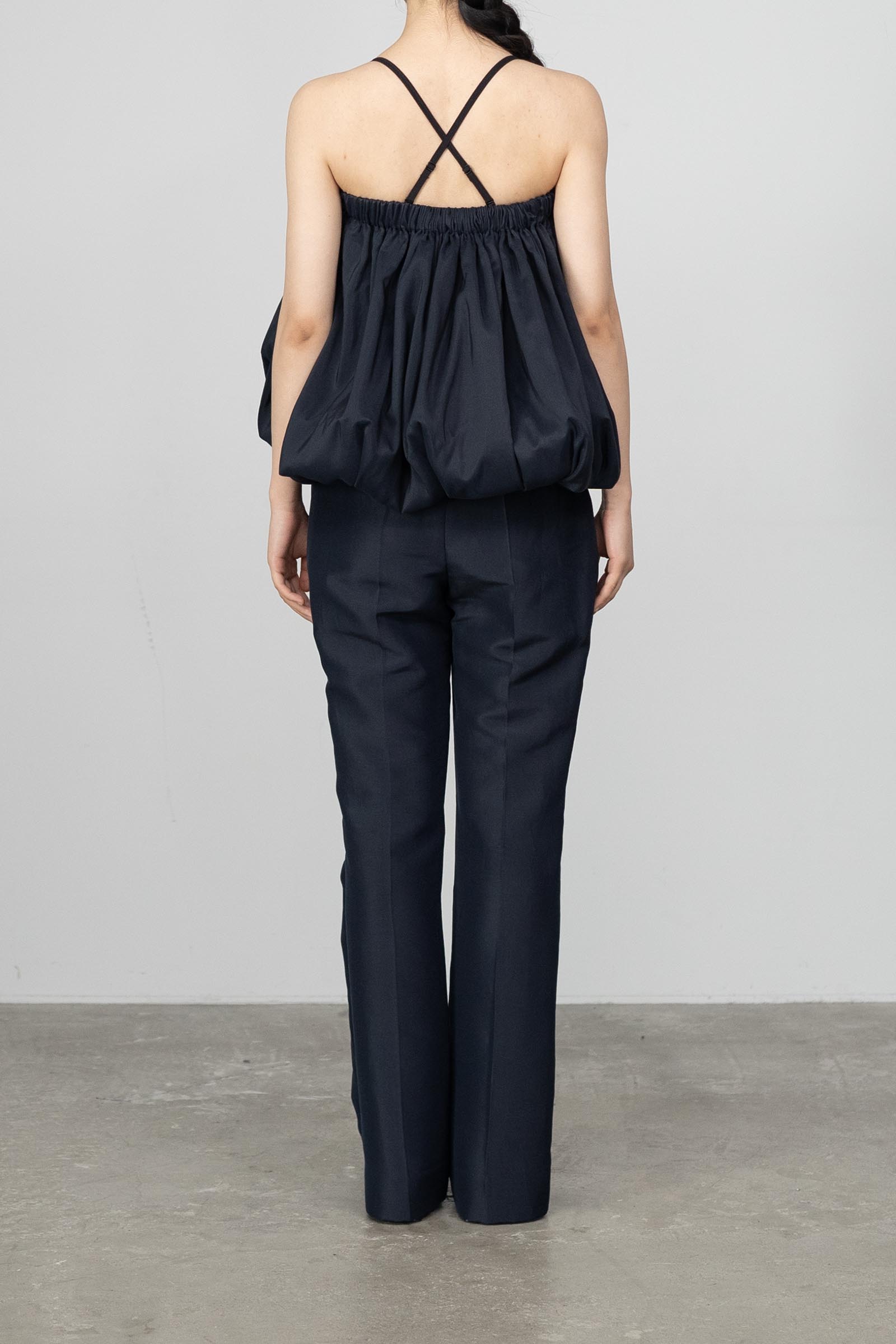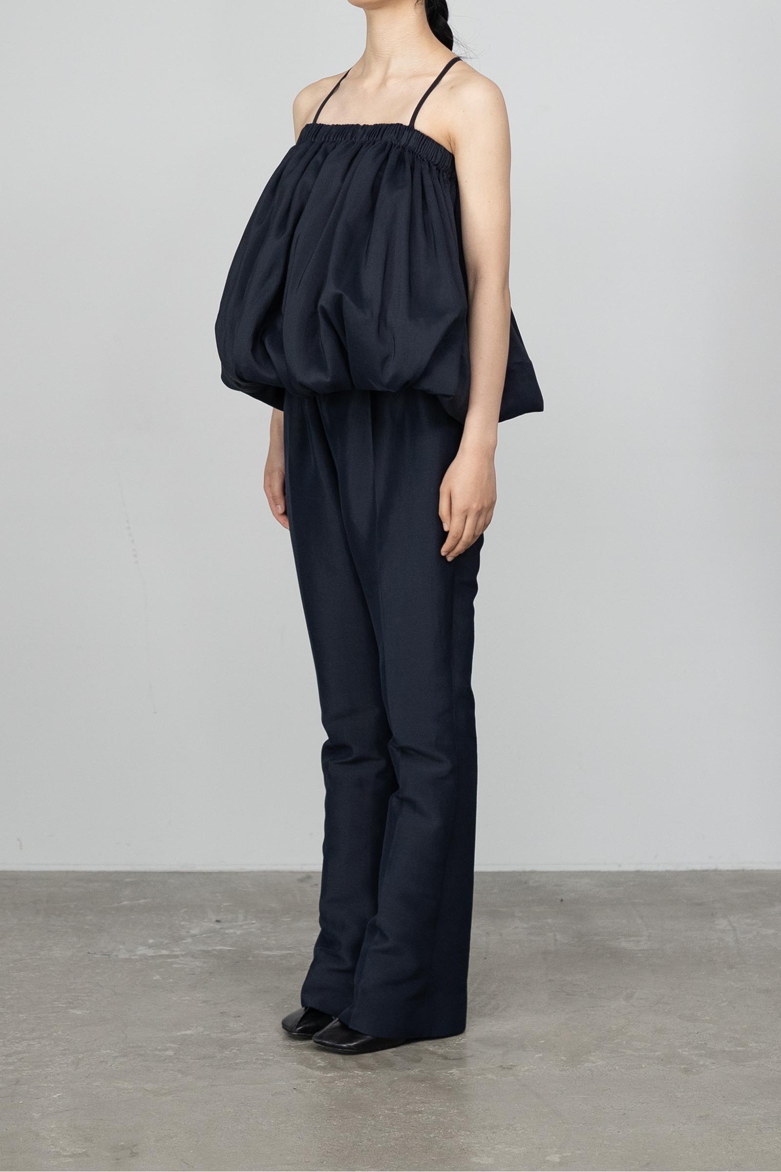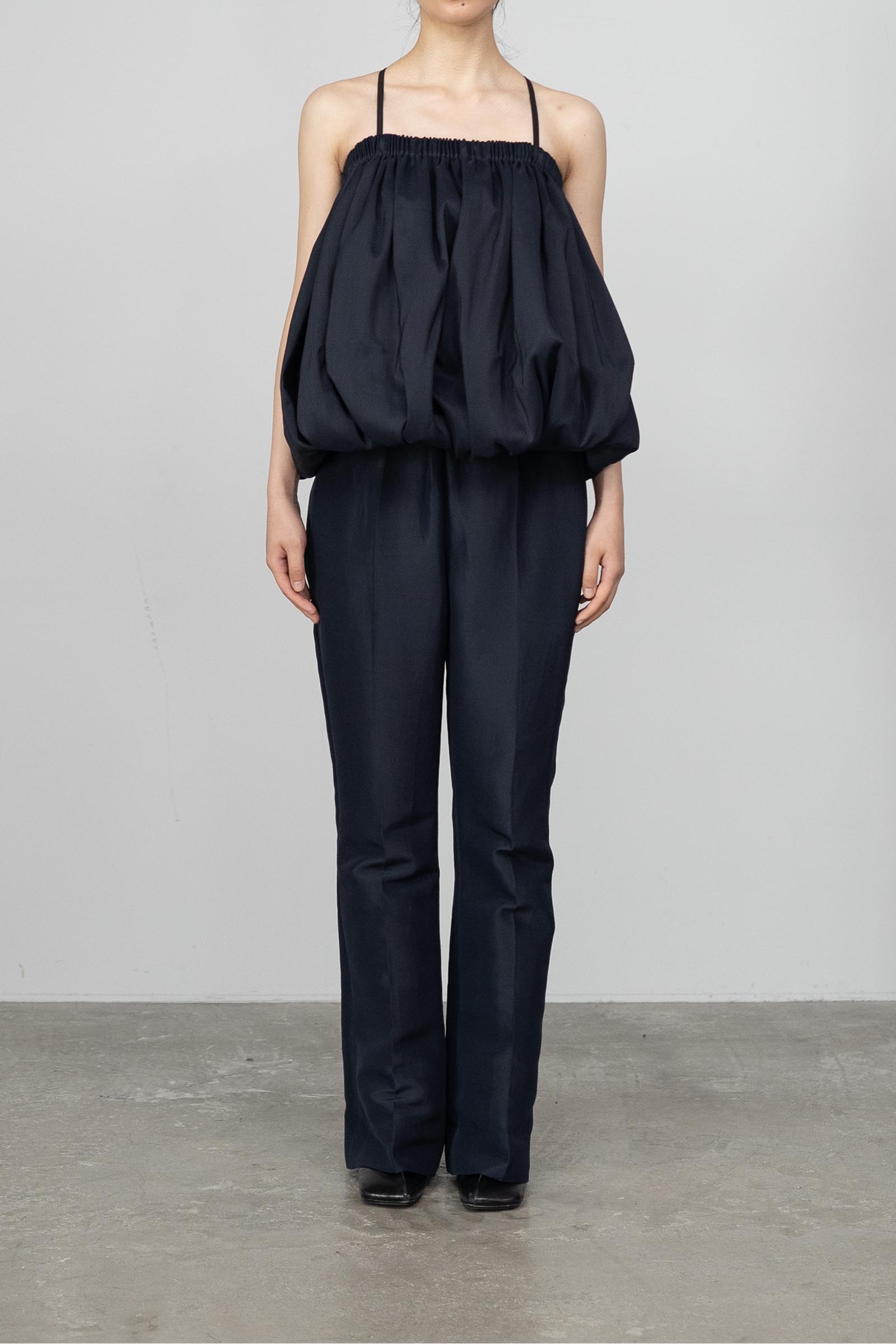 様々なバリエーションで着用可能なオールインワン。ウエストを二重にしてスカートとして、ベアトップのオールインワンとして、また腕を通してオフショルダーとしていくつかのバリエーションを楽しんでいただける。