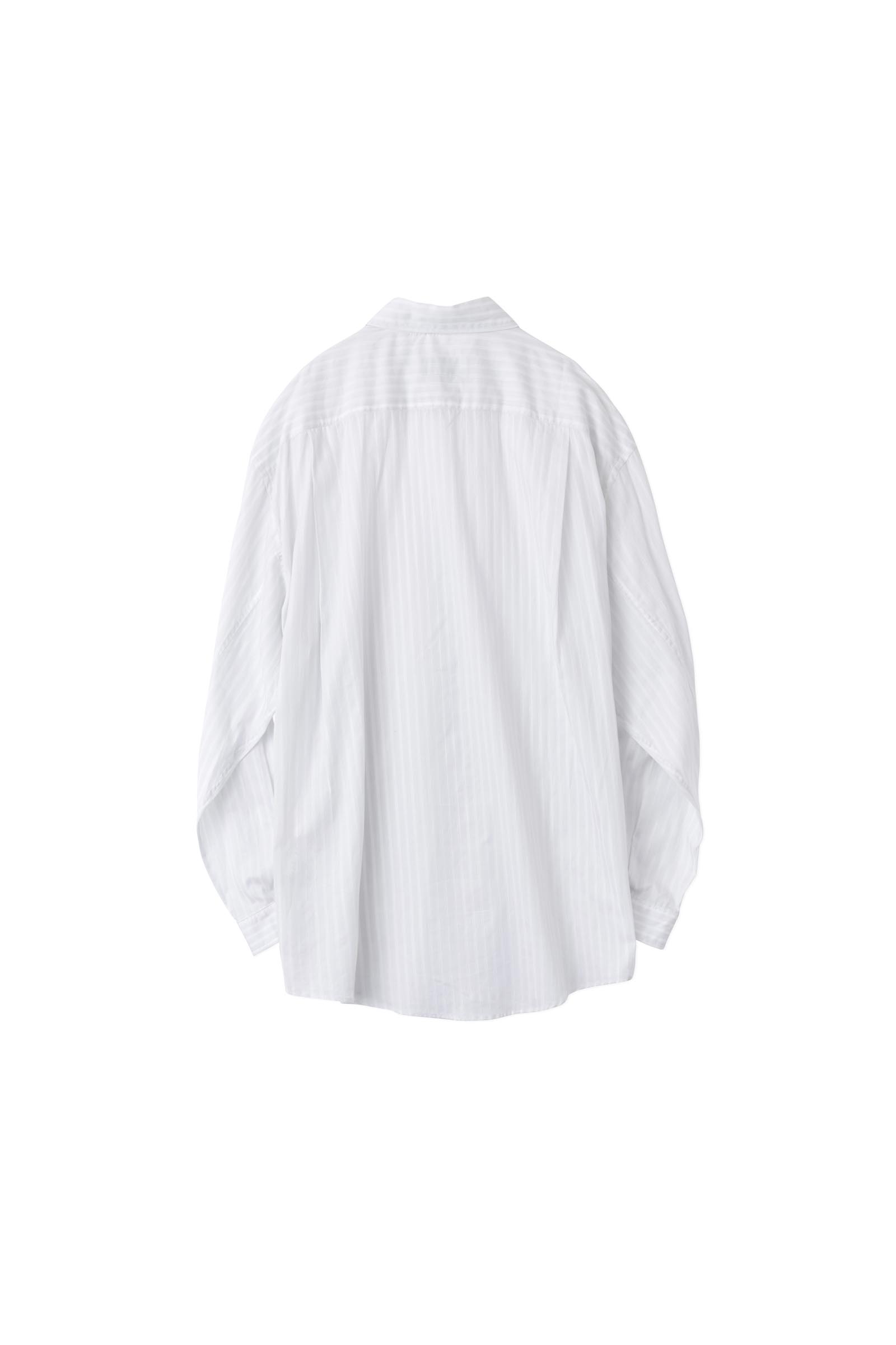 上品でハリ感のあるコットンを使用したシャツ。うっすらと見える細かなストライプがアクセントに。オーバーサイズシルエットだが、クリーンな印象の生地のためセットアップにインナーにするなど刺しのアイテムに使ってもよい仕立てになっている。一枚でもレイヤードしても様になる一枚。