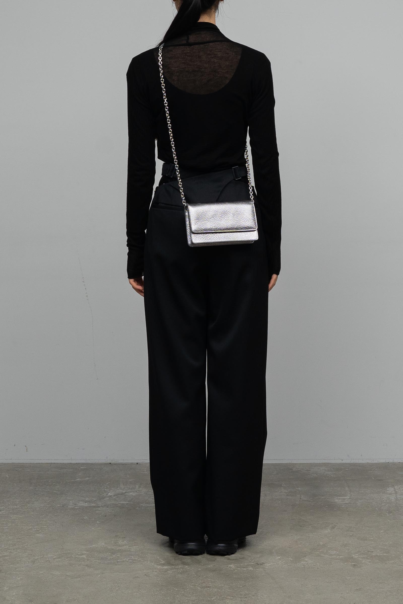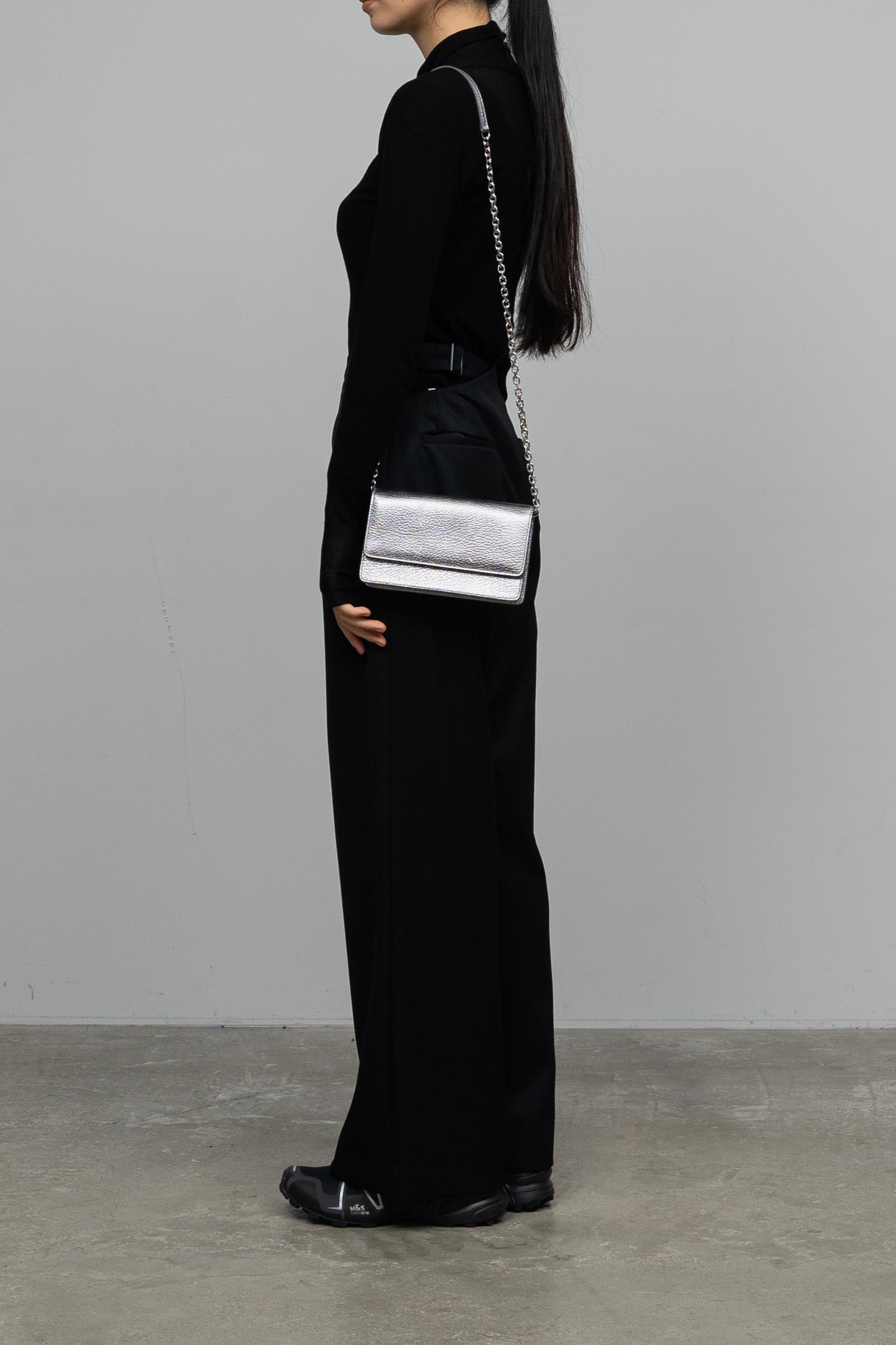 エンボス加工が施されたグレイニーレザー製のウォレット。チェーンは取り外しが可能でクラッチとしても使用可能。スナップボタンクロージャーと紙幣を収納するセクションが備わっている。