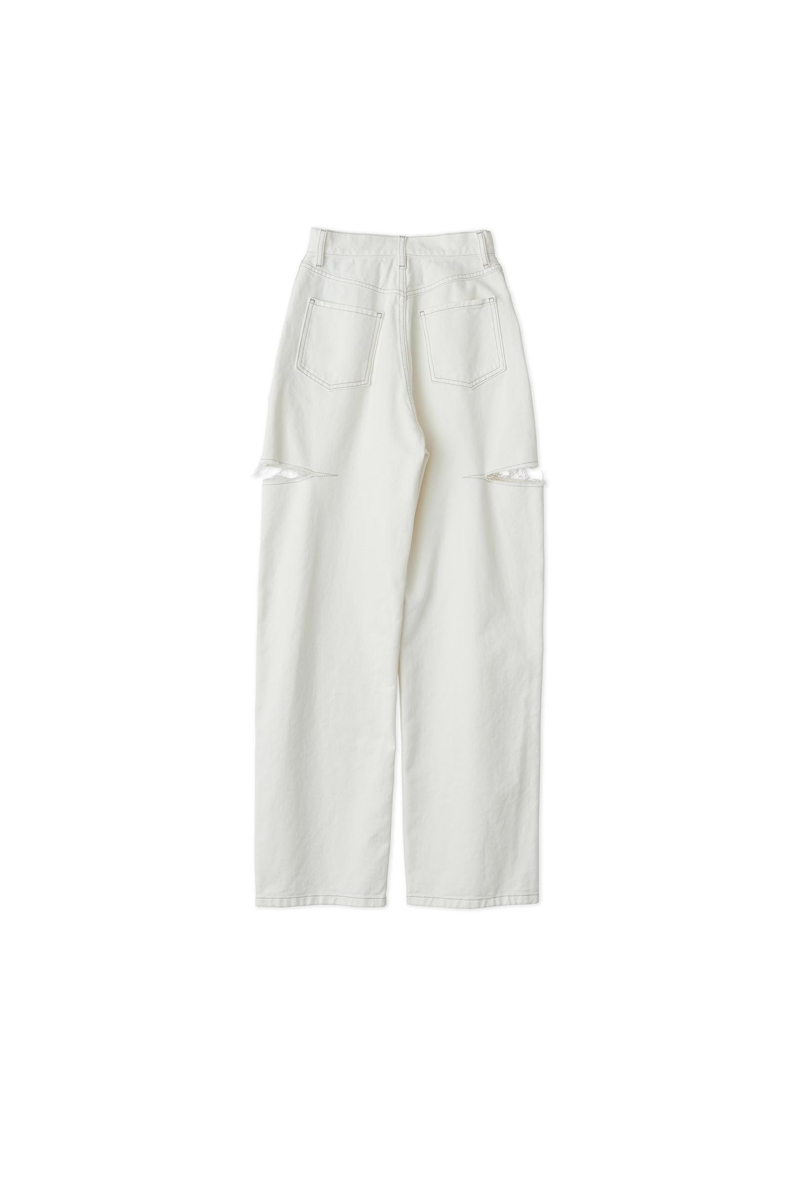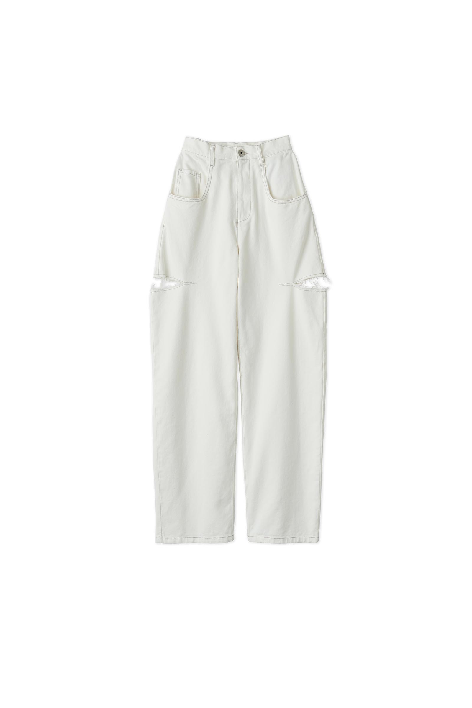 ストーンウォッシュの色合いを表現したルーズなフィッティングの5ポケットデニム。シルエットはストレートで存在感のあるボリューム。太腿のスラッシュは大胆かつラフにカッティングされ、独特なシルエットが生み出されている。スラッシュ部分のほつれた糸もこのデニムの持つ雰囲気の良さを演出している。