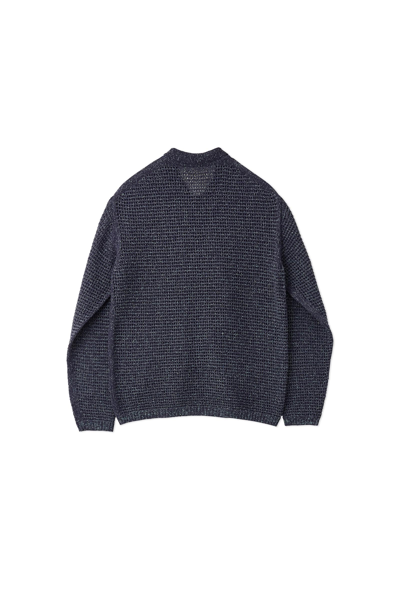 定番のギマコットンとスラブ糸を撚り合わせたメッシュシャツカーディガン。全シーズンまでは2種類の糸で2色を撚り合わせていたが、今シーズンはより色の混ざりを複雑にするために、スラブの糸を2色混ざった糸を使用し3色に。編みの組織をメッシュ編み、各パーツは全て天竺編みで縁取りをしている。着て動くと涼しい不思議なニット。