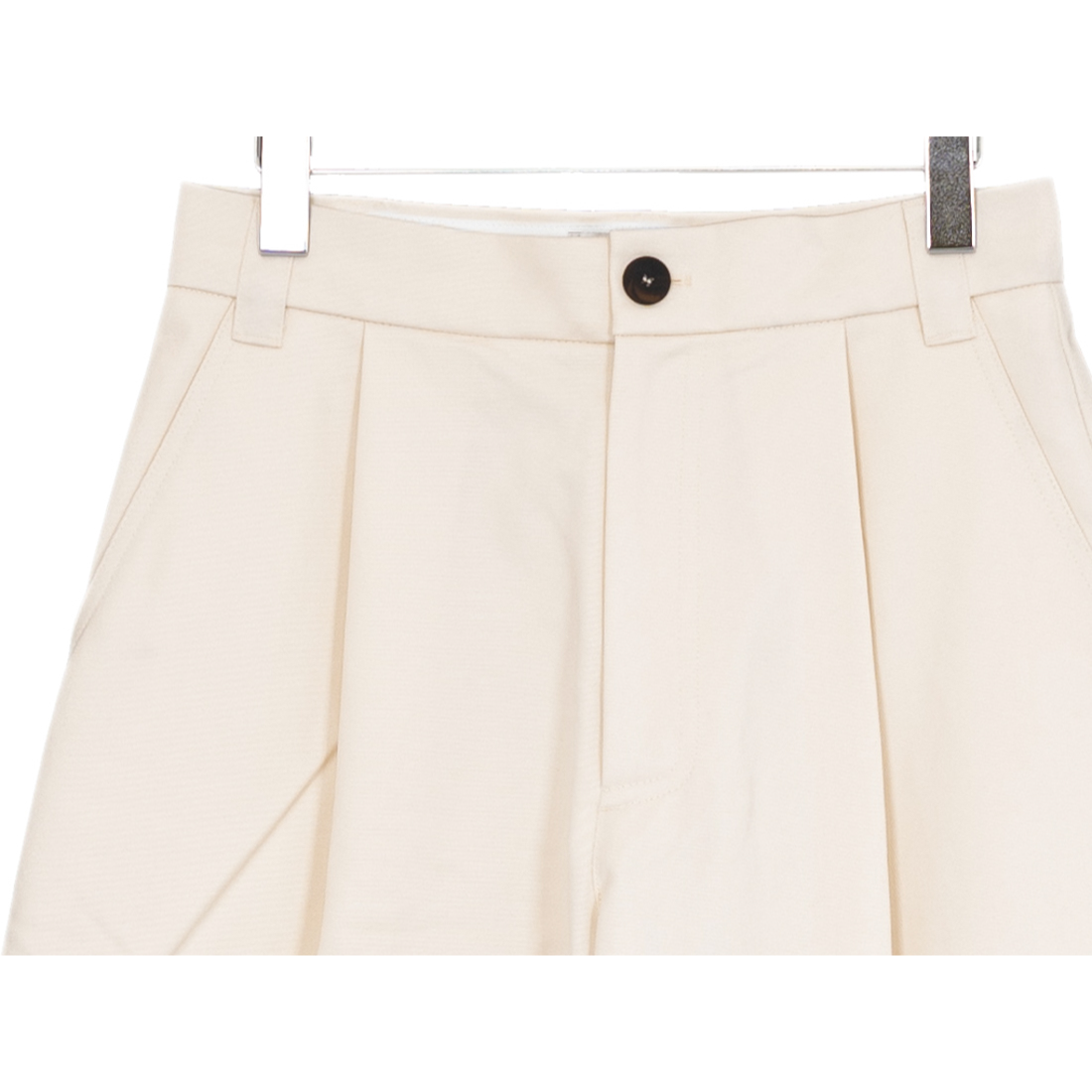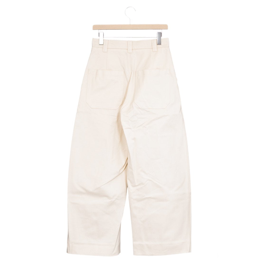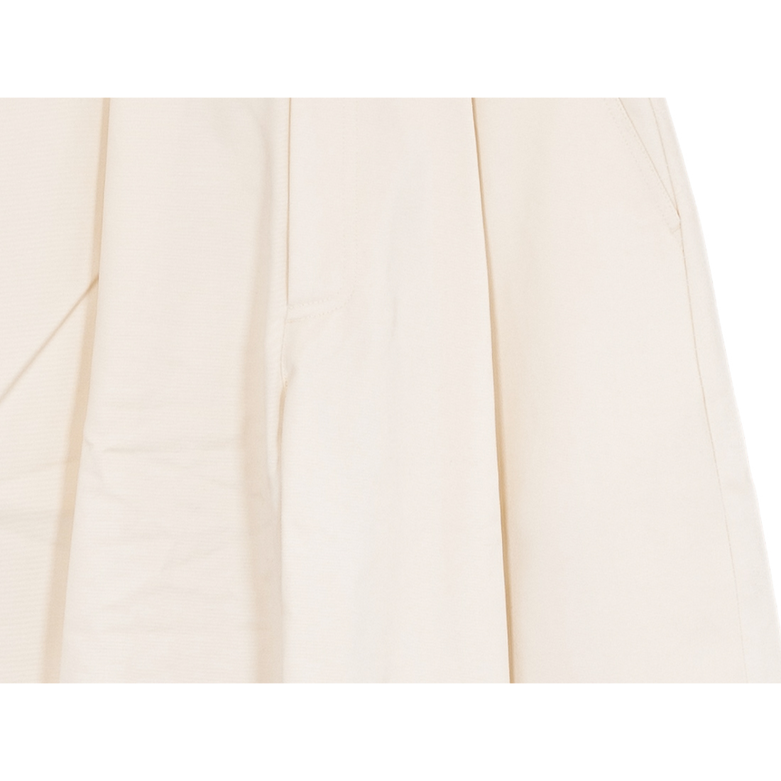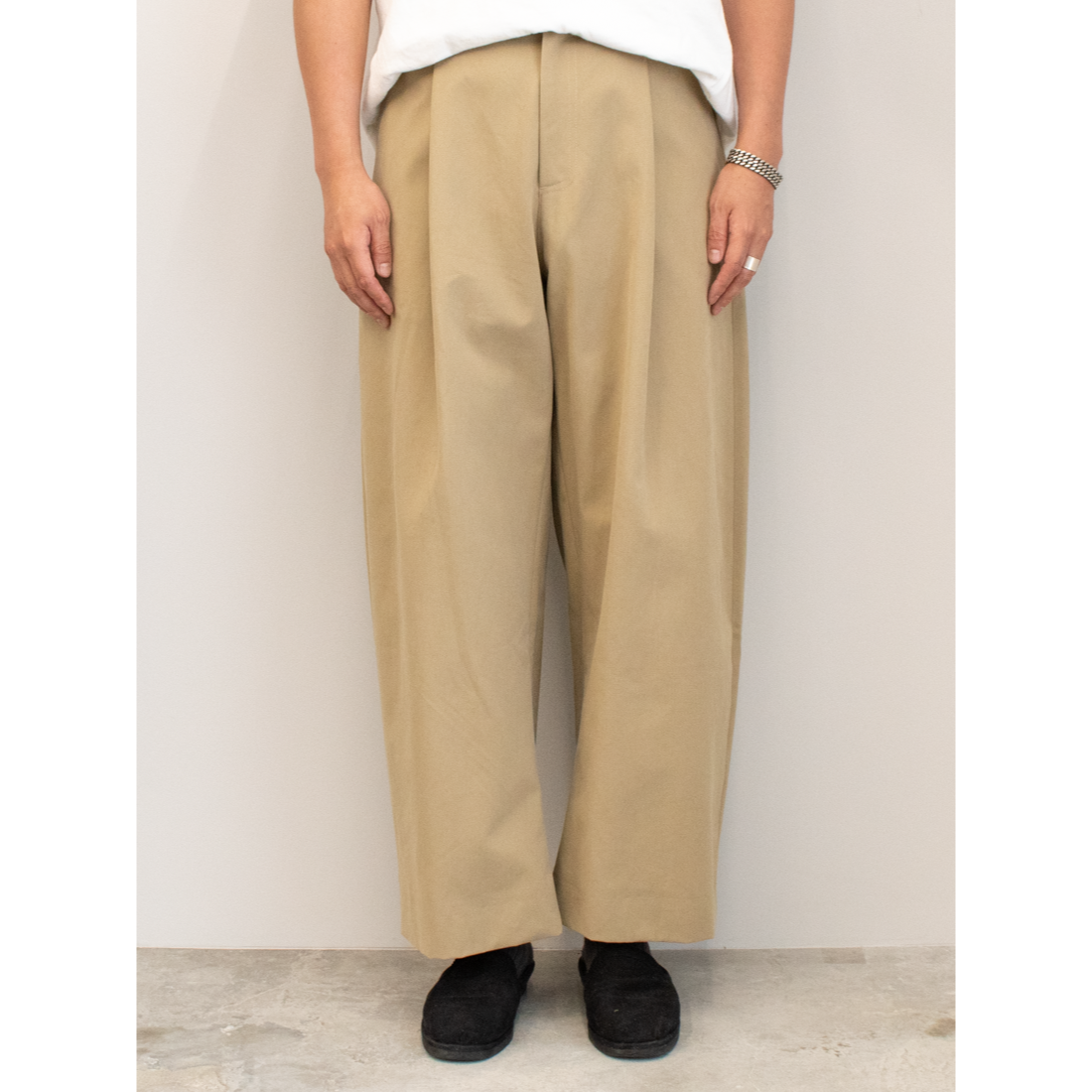 上質で肉厚なコットンをピーチ加工で仕上げたボリュームパンツ。 しっかりとしたハリと厚みのあるツイルをピーチスキン加工(表地に桃の表面のような短い毛羽をつくり、しなやかで温かい風合いに仕上げる加工)によって柔らかい質感に昇華した生地が季節感を演出してくれる。シルエットは深めに入ったタックがボリューム感を出してくれるワイドシルエット。ミニマムにまとめられた中にSTUDIO NICHOLSONらしいエッセンスが凝縮されている。