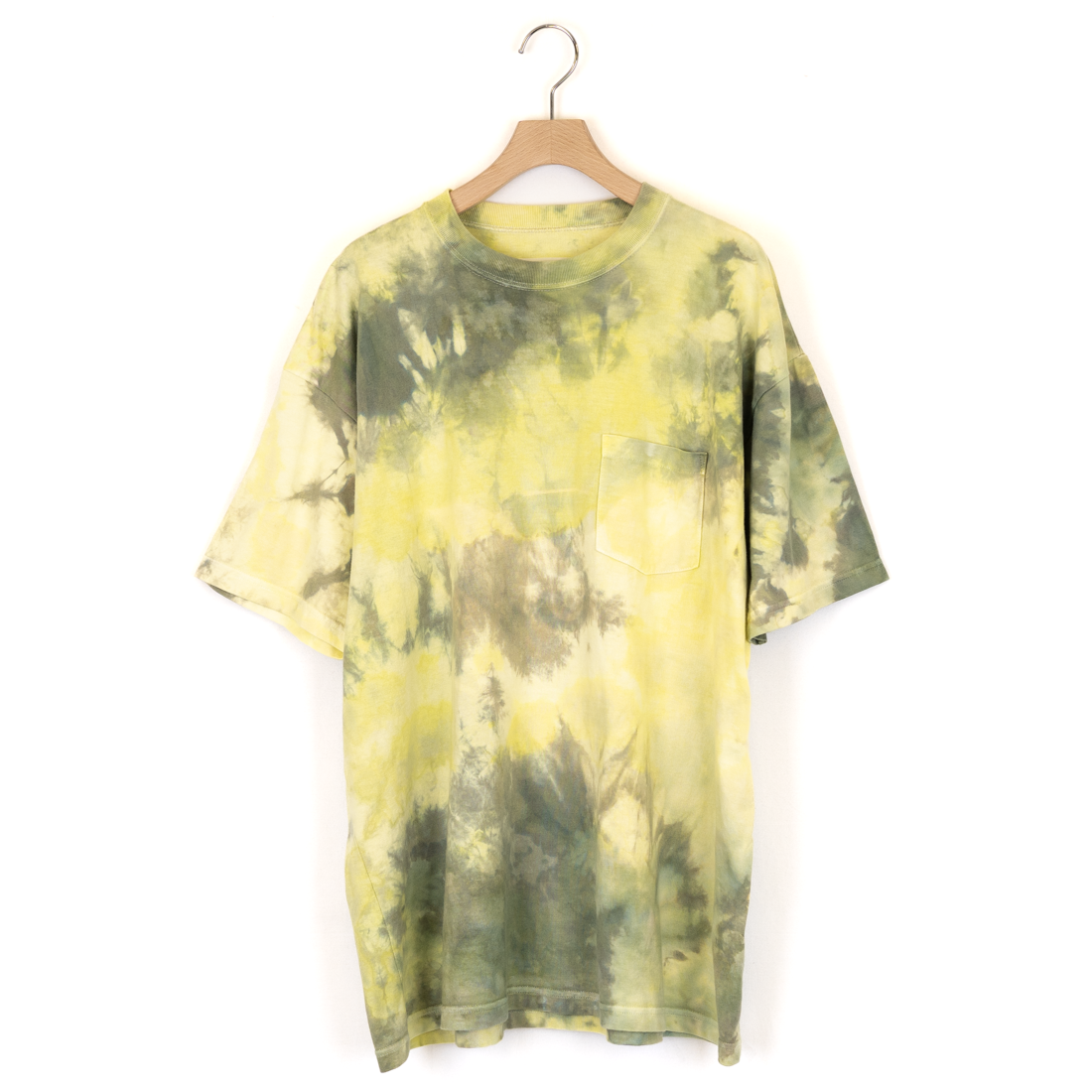 ”染め”表現を独自のフィルターで研究し、掘り下げている畑野さんにお願いしたタイダイTシャツ。希少な蛍光イエローの染料を使用し、最初に薄い膜をはるようなイメージで染めてもらい、そこから薄く色を5〜7層と重ねていき1点1点違った表現、方法で染色し製作。生地、染める時間、絞りの強さ、染料同士の相性、色の出し方など様々な要素から色、柄がつくり出されていきる。ボディはこのTシャツを製作するために、事前に染料の入り方、着心地、染め後のシルエットのバランスを実験し製作したオリジナルのコットンボディを採用。