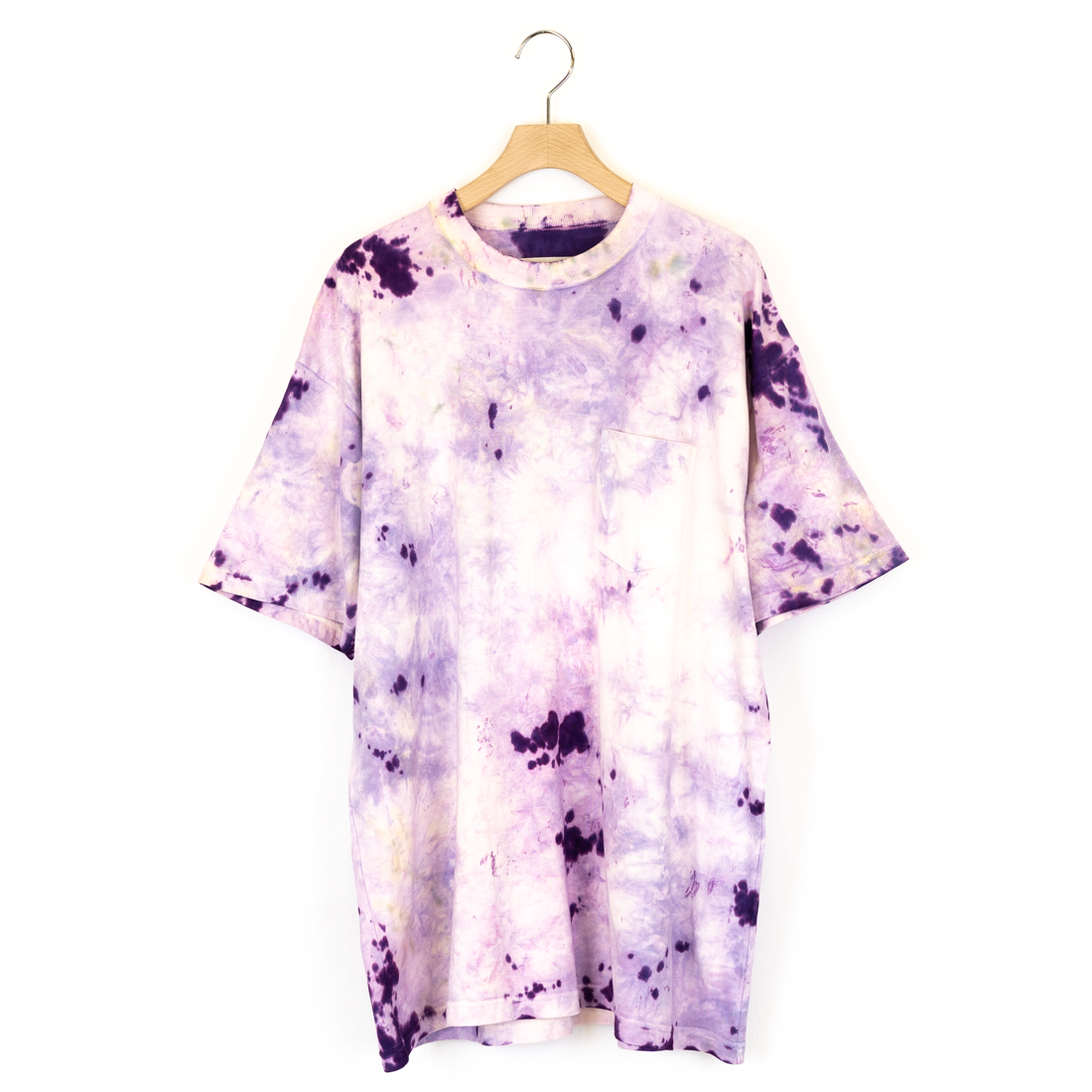 ”染め”表現を独自のフィルターで研究し、掘り下げている畑野さんにお願いしたタイダイTシャツ。希少な蛍光イエローの染料を使用し、最初に薄い膜をはるようなイメージで染めてもらい、そこから薄く色を5〜7層と重ねていき1点1点違った表現、方法で染色し製作。生地、染める時間、絞りの強さ、染料同士の相性、色の出し方など様々な要素から色、柄がつくり出されていきる。ボディはこのTシャツを製作するために、事前に染料の入り方、着心地、染め後のシルエットのバランスを実験し製作したオリジナルのコットンボディを採用。