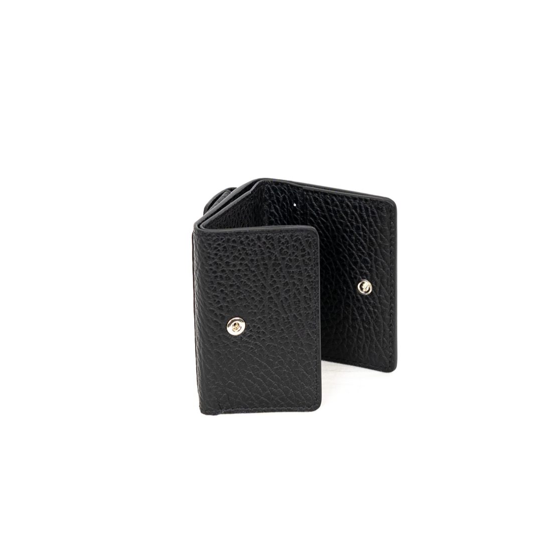 エンボス加工を施したグレインレザーを使用したウォレット。外側にはスナップボタンのエンベロップポケットがデザインされていてる。内側はカードスリーブついており、ミニマムなデザインだが、利便性を兼ね備えている。バックにはブランドを象徴するホワイトの4本ステッチが施されている。上質なレザー、イタリア製のきめ細かな縫製が上品なアイテム。
