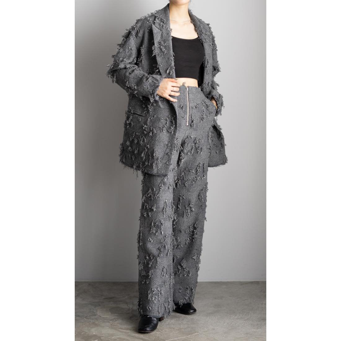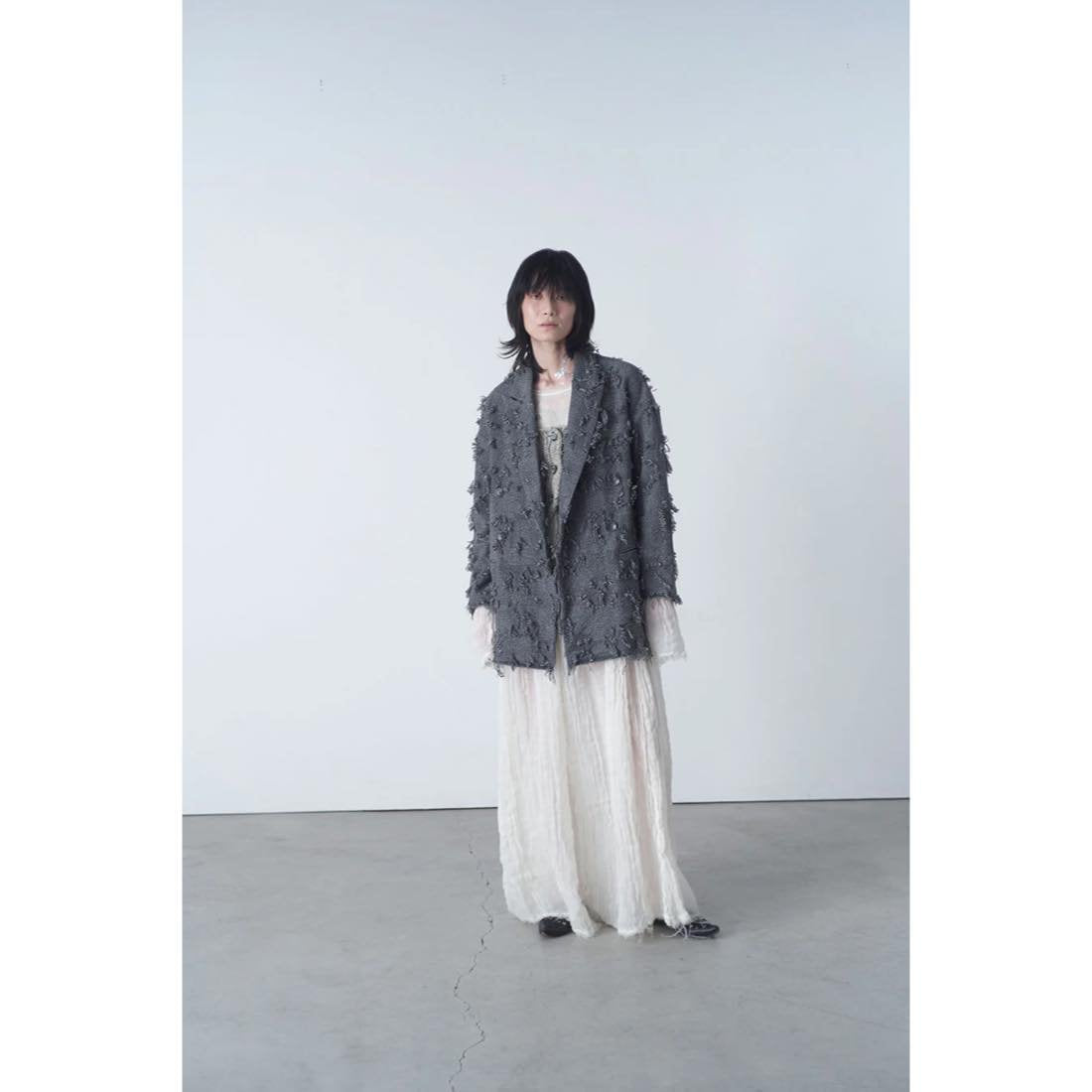RIPPED=破れたという意味。今期のメインファブリックでもある、RIPPED WOOL メンズライクなトップカラーの糸を3色ずつねじり、尾州で織っているオリジナル生地。製品があがってきたら、1着1着手作業にてカットし、更に湯洗い加工を加工場で施し製作。とても手間のかかる工程を経て、他にはないERiKOKATORIらしいインパクトある特別な生地に仕上がっている。オーバーサイズのWジャケット。やや長めの着丈に設定されているため、ニーハイやひざ丈ブーツ合わせもおすすめのアイテム。