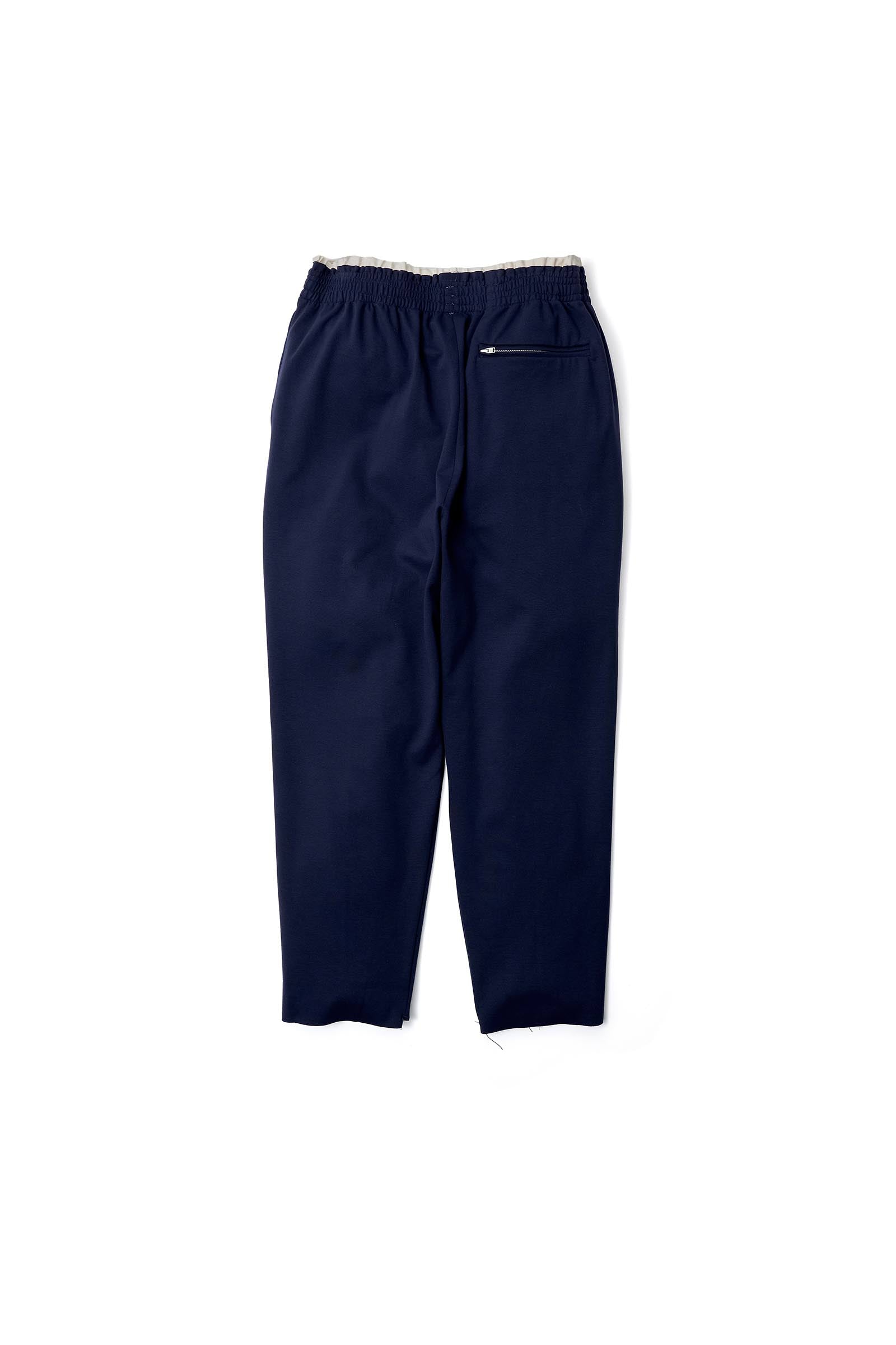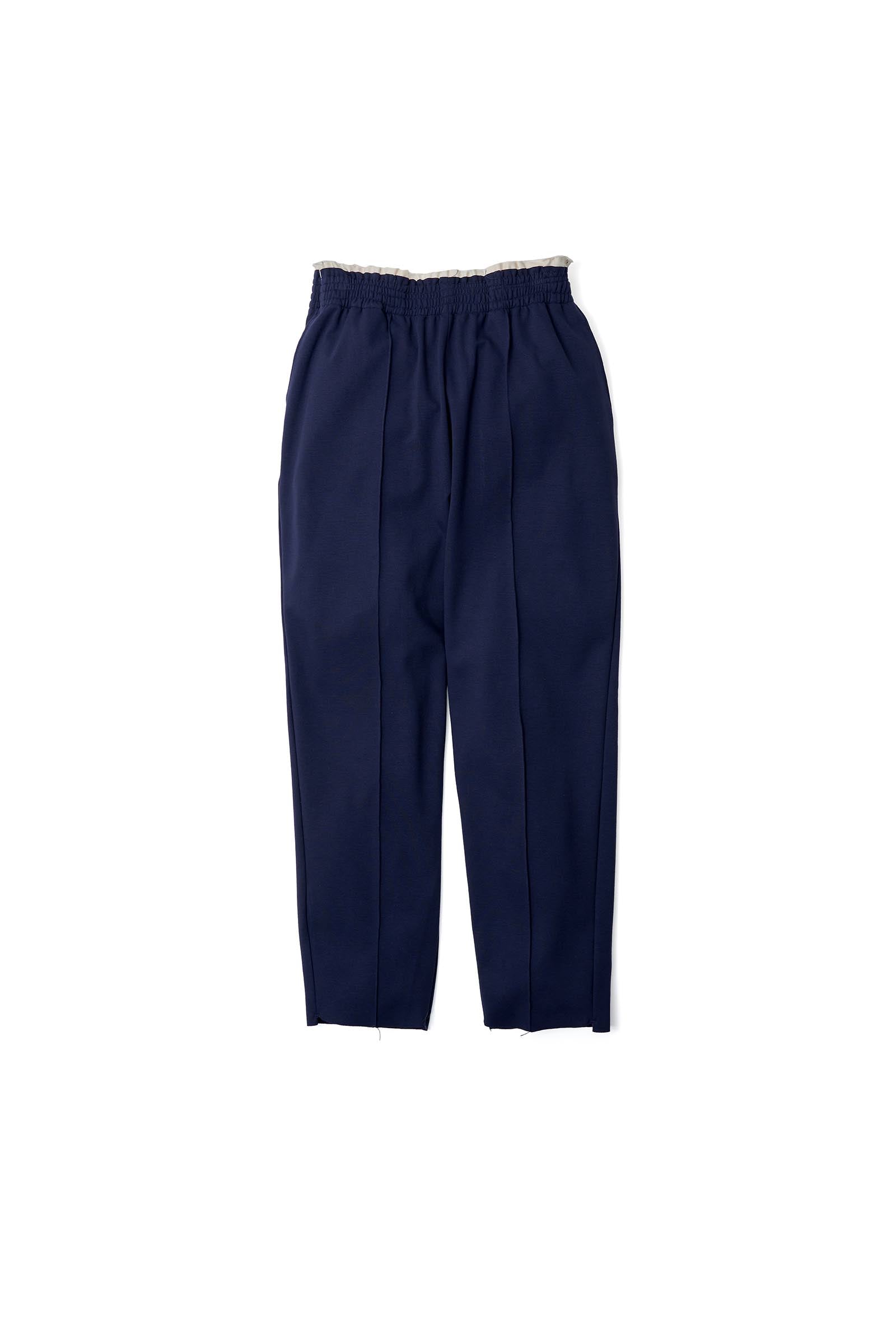 ハリ感のあるジャージー生地を用いた、クロップド丈のテーパードシルエットのトラックパンツ。ウェストにコントラストを効かせた素朴な生成りのスレキ生地とのレイヤーのデザイン、ブランドを象徴するカットオフや不規則なステッチワークのディテール、フロントにピンタック、両サイドにスリップポケット、ジップ付きの右バックポケット。