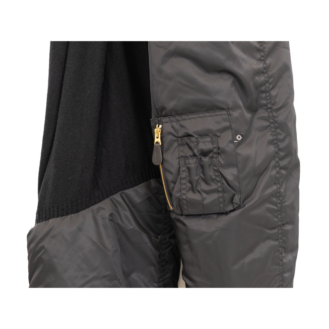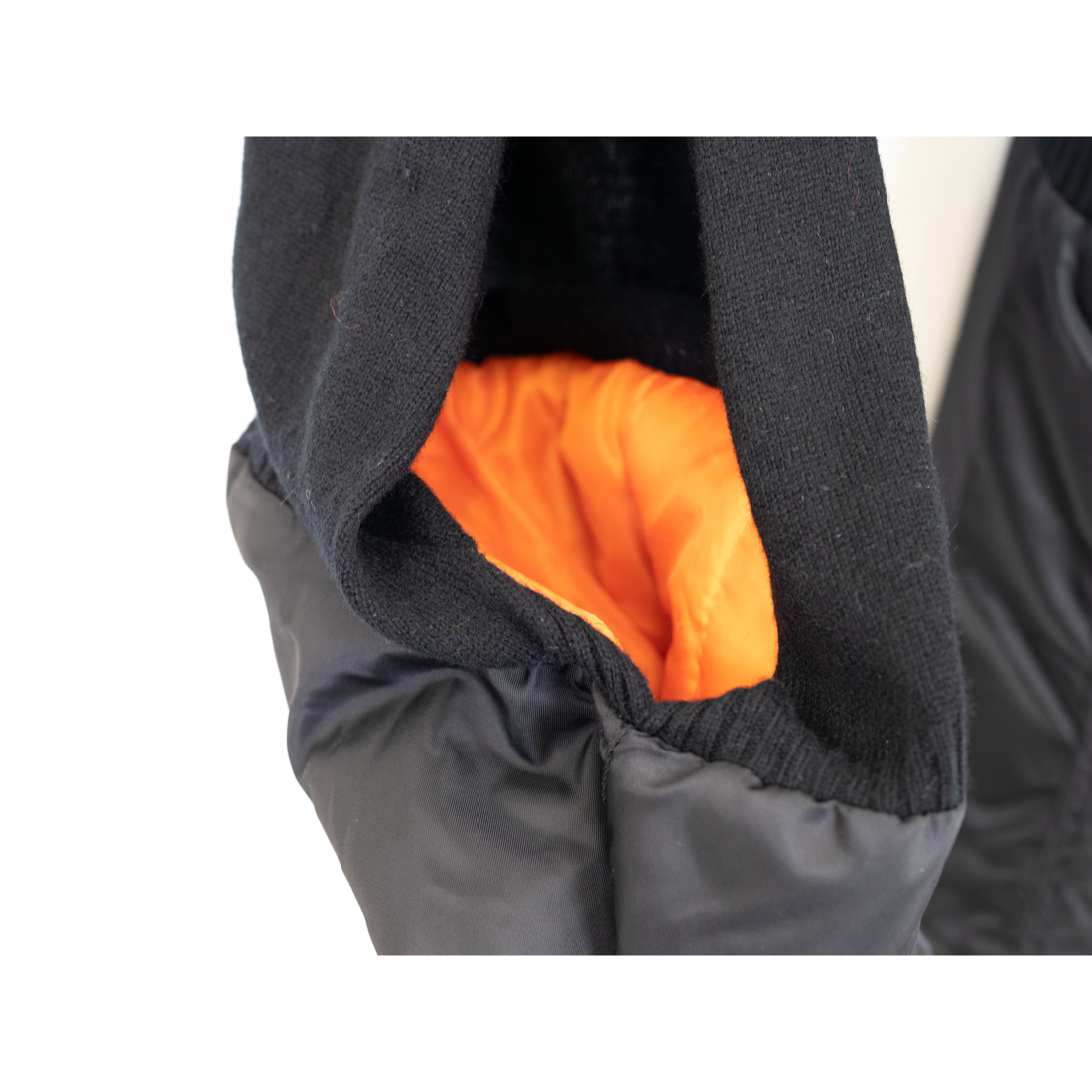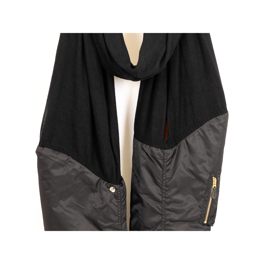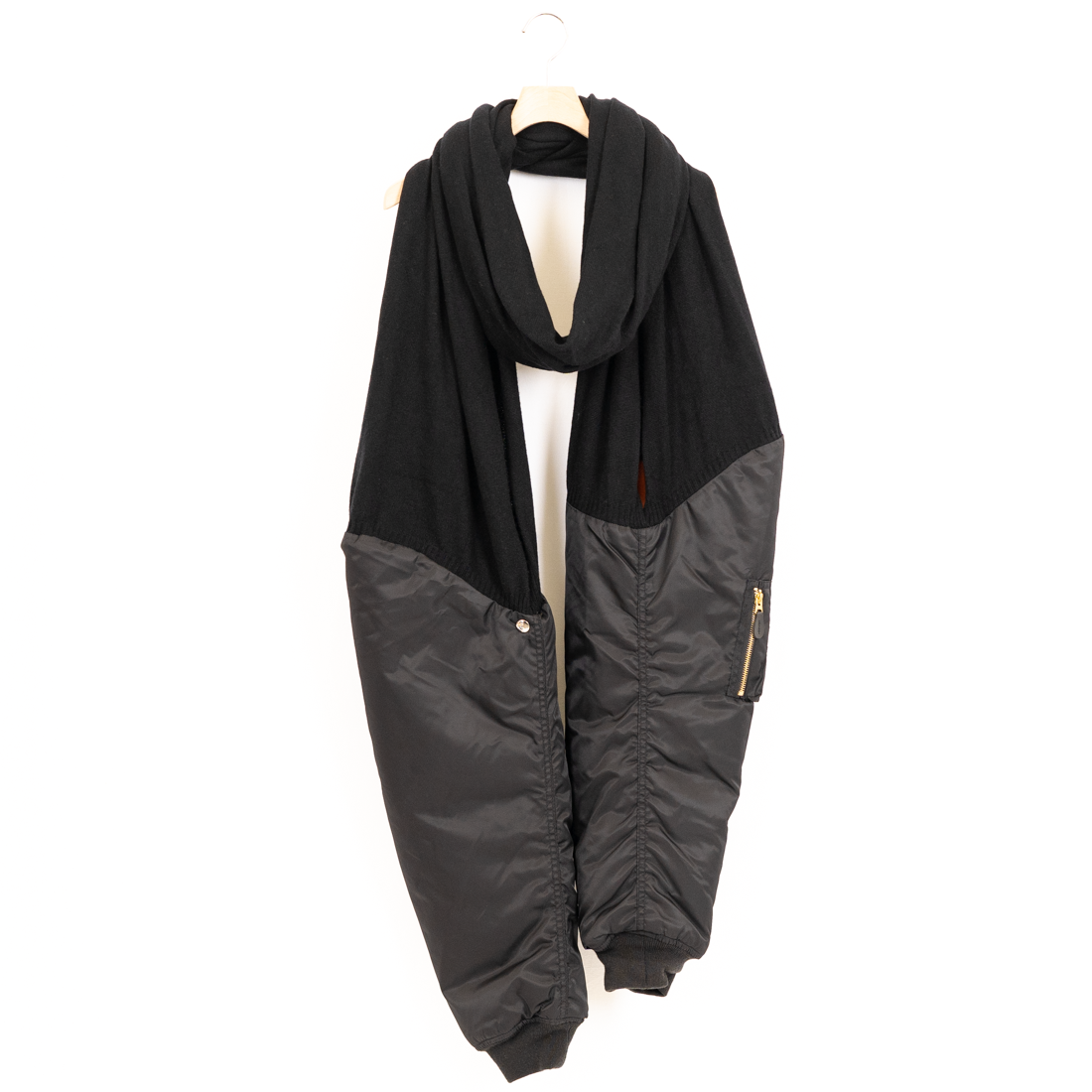 ボンバージャケットのスリーブとニットをドッキングさせたユニークなデザイン。スリーブとして着用してもストールとして巻いて着用してもよし。コーディネートに圧倒的な存在感を与えてくれる。