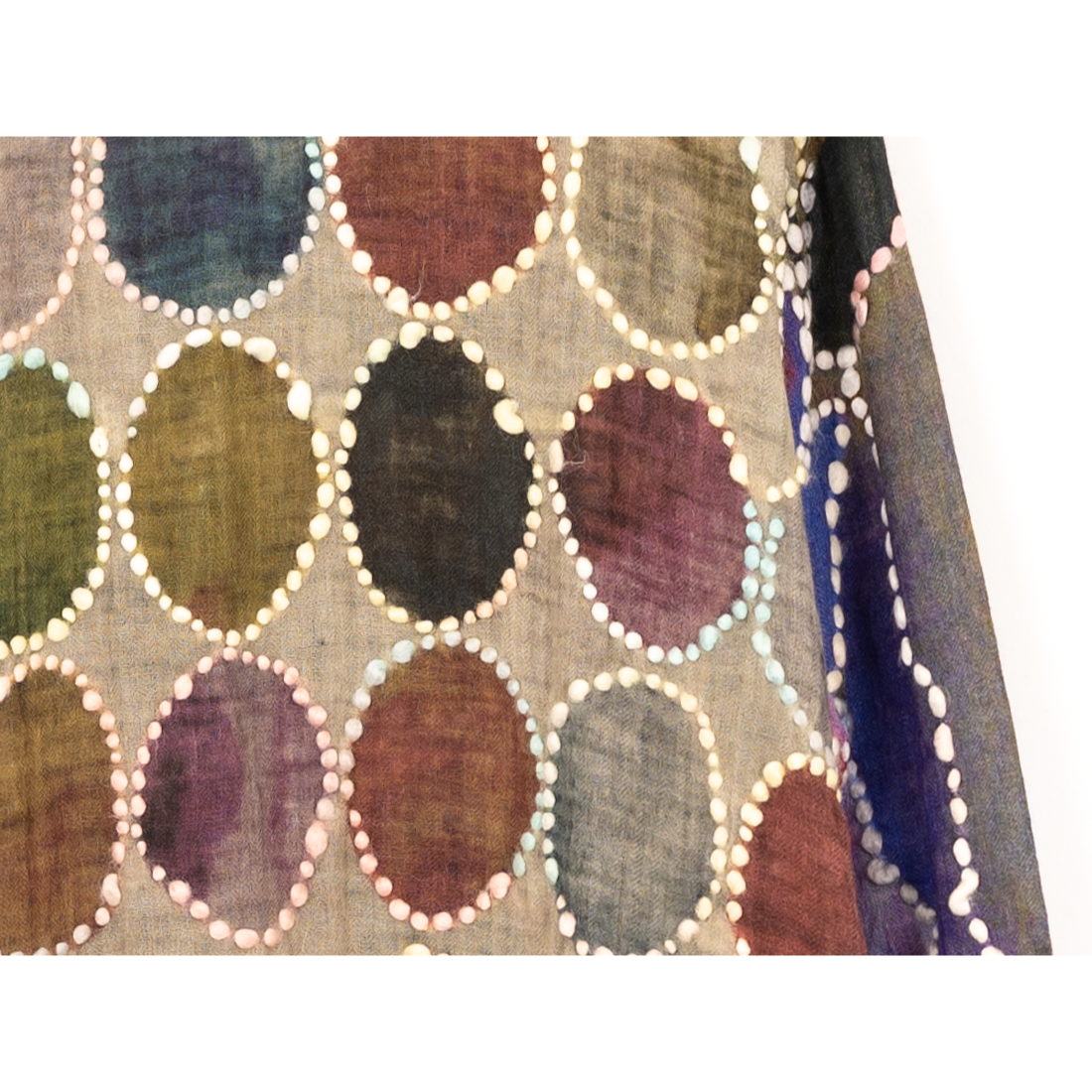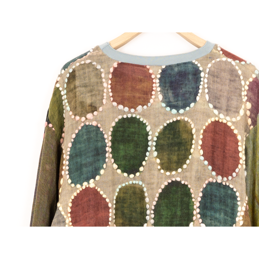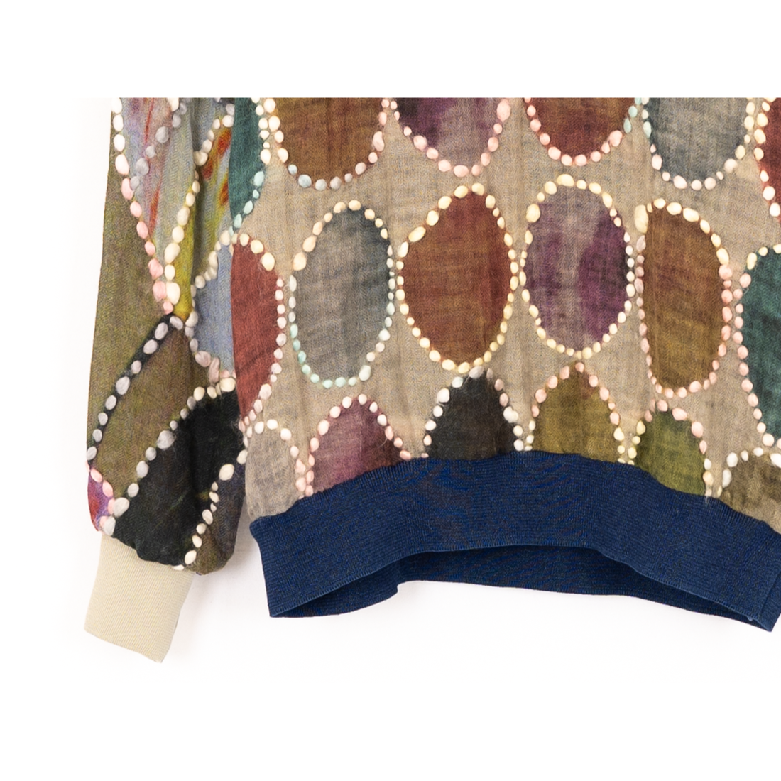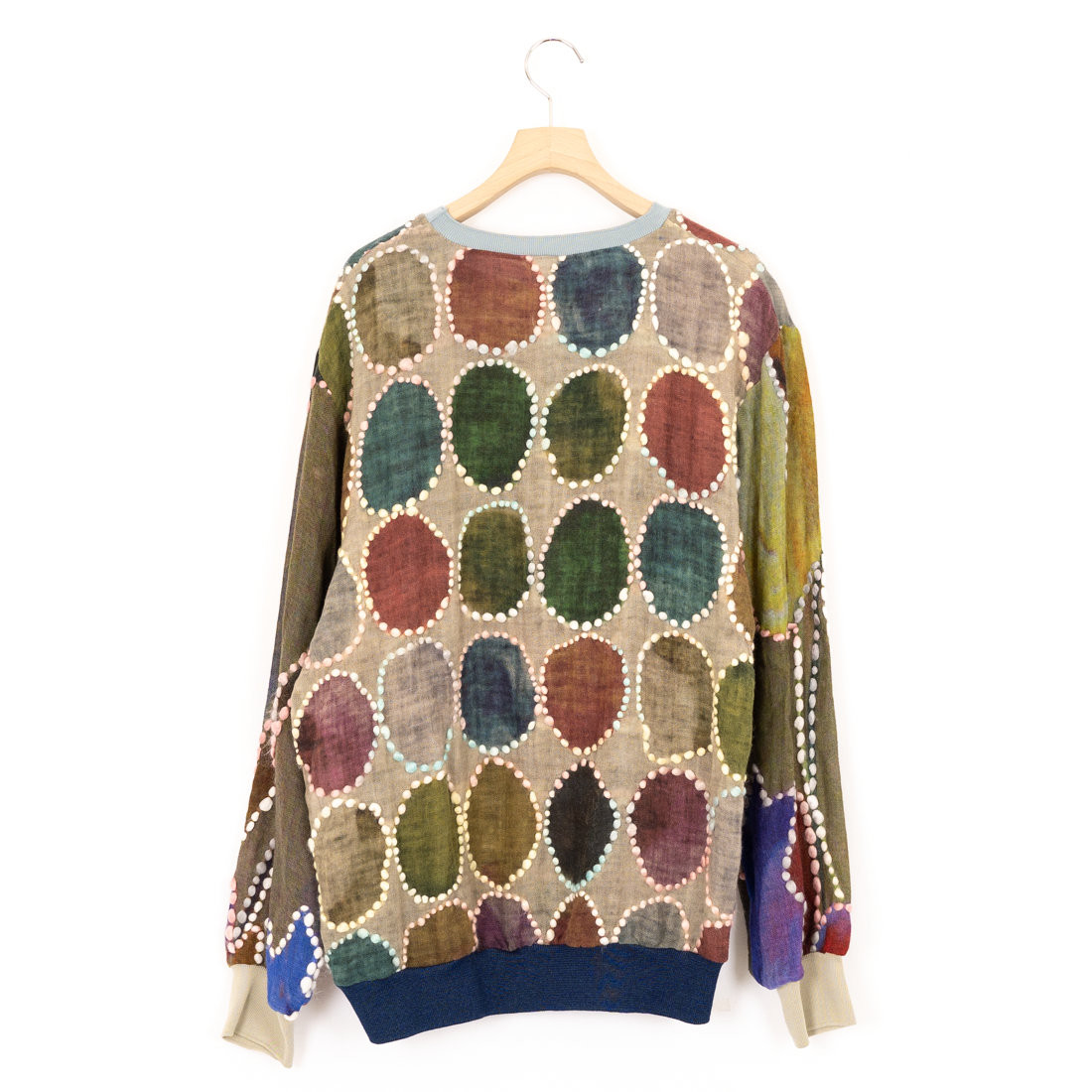 カラフルな配色と太めのステッチが目を引くプルオーバーニット。 薄手の生地感のため、春先に着やすい仕様に。 シルエットはやや細身。 一点物のスペシャルピース。 アートのようなデザインがBLESSらしい個性を感じさせてくれる一枚に。