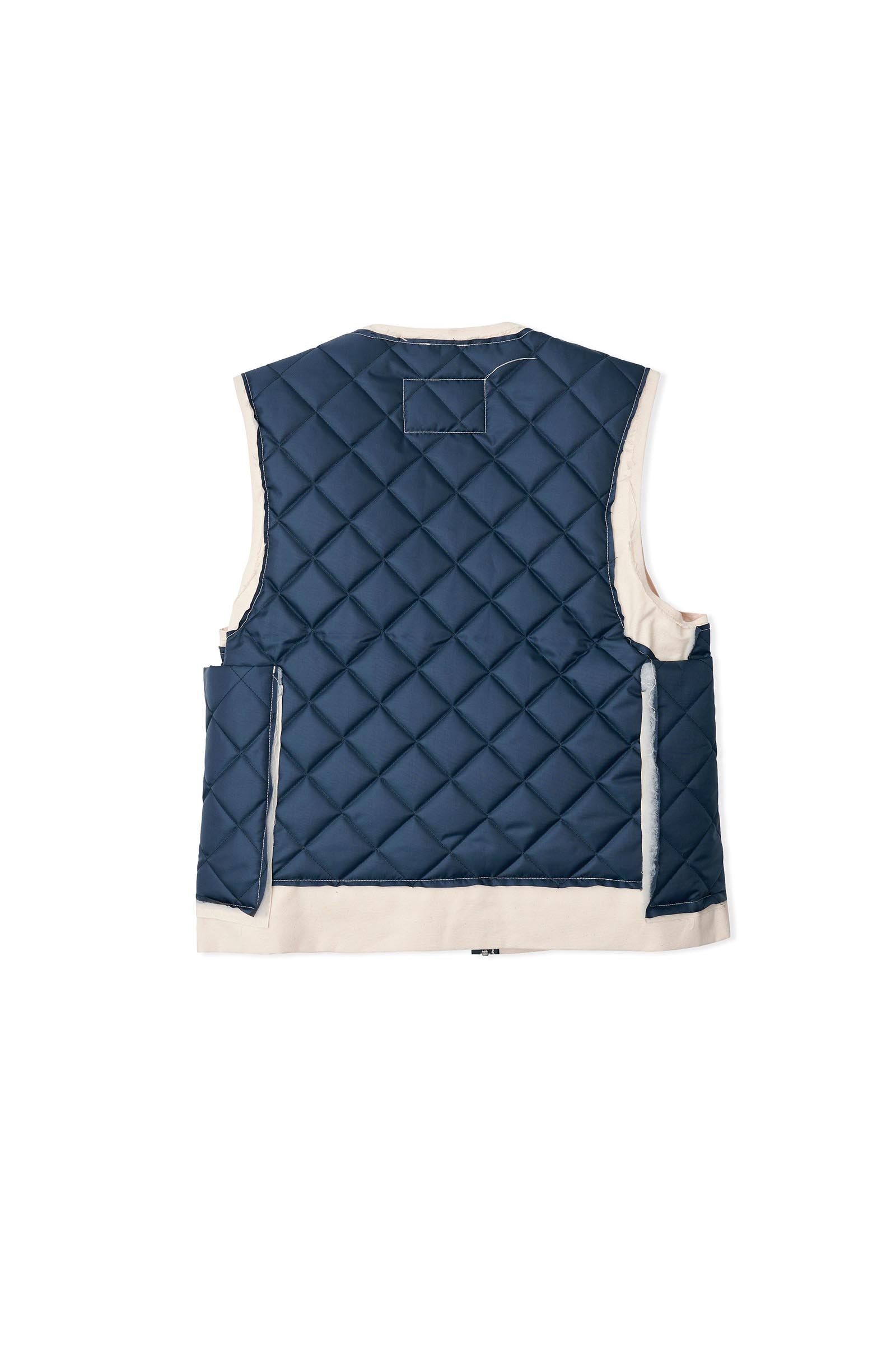 生成りのキャンバス生地に中綿入りのキルティングナイロンを叩き付けたようなデザインのパデットベスト。意図したイレギュラーなバランスにブランドのシグネチャーであるカットオフのディテール、首元まであるフロントのジップと巨大なパッチポケット、キルティングナイロンには撥水加工が施されている。
