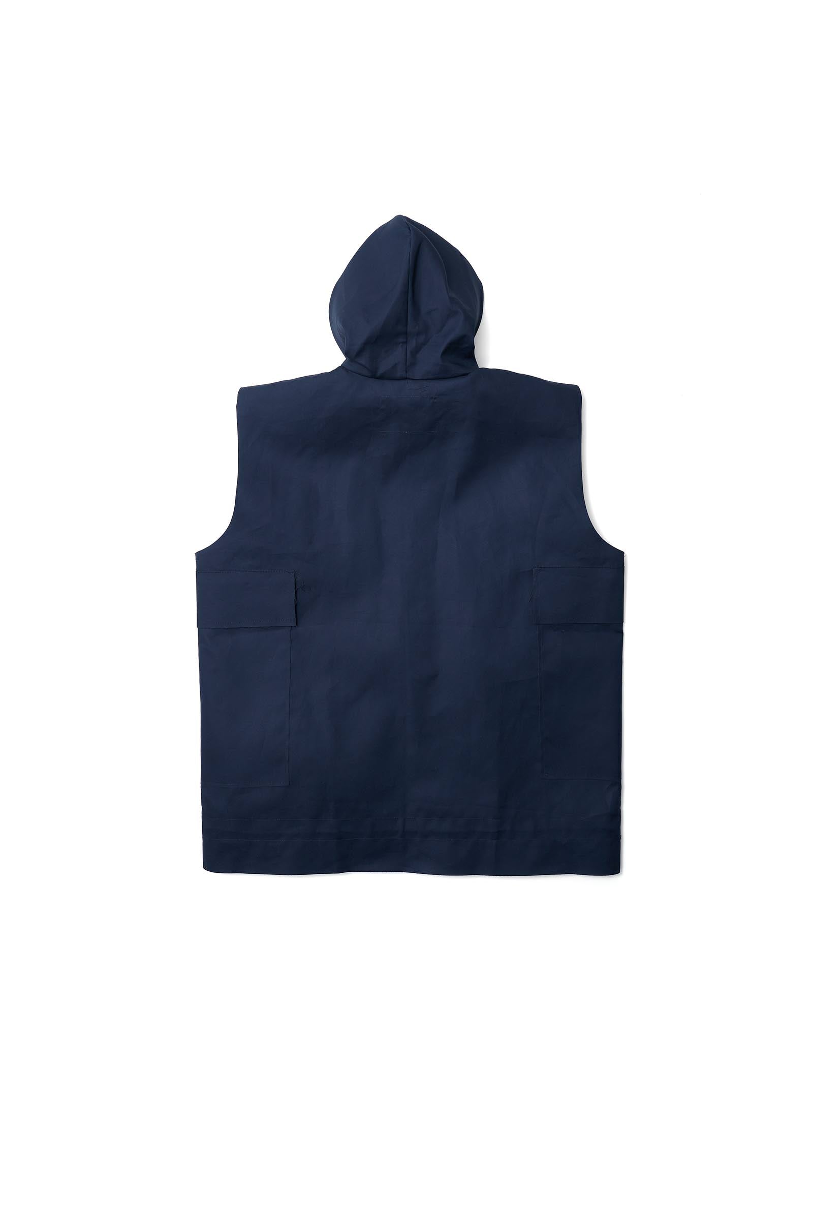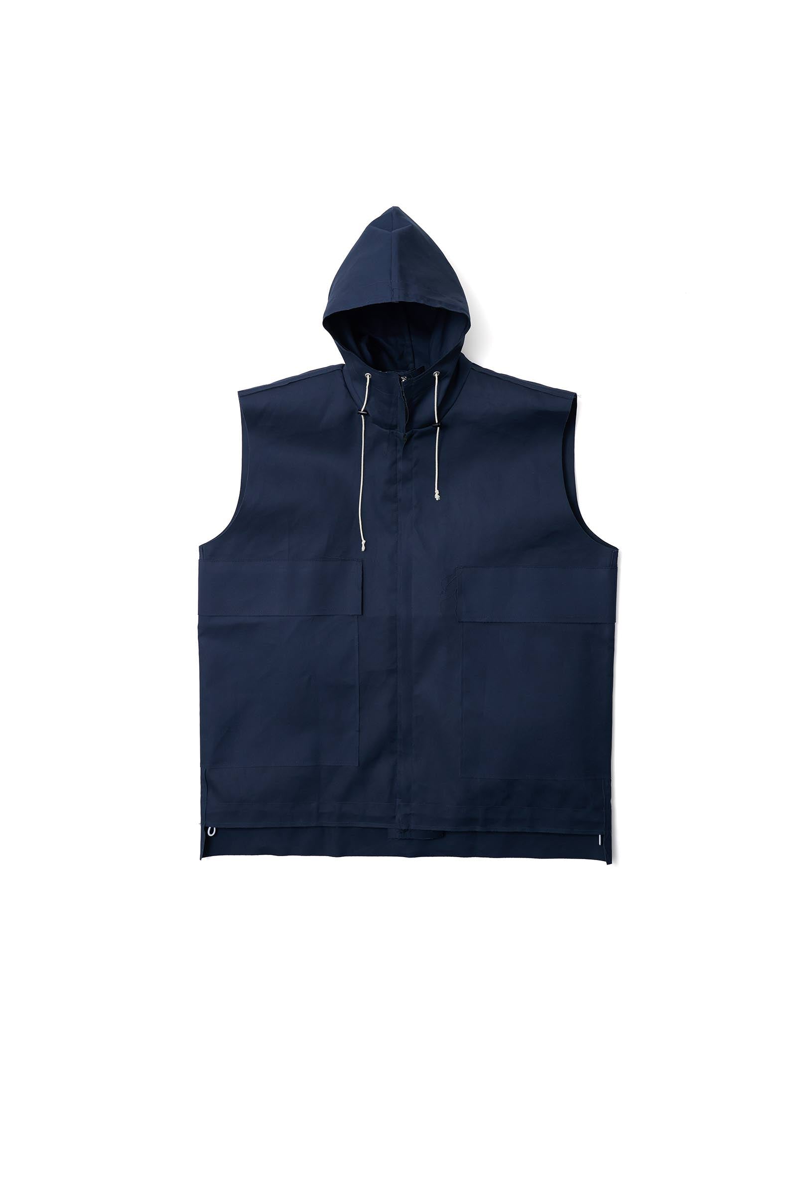 撥水加工のマッキントッシュ生地を使用したオーバーサイズシルエットのノースリーブジャケット。ドローコード付きのフード、背面まであるフラップ付きの巨大なパッチポケット、特徴的なカットオフや未処理のディテール。裾にもドローコードが付属されているので、スタイリングに合わせて絞る事が可能。