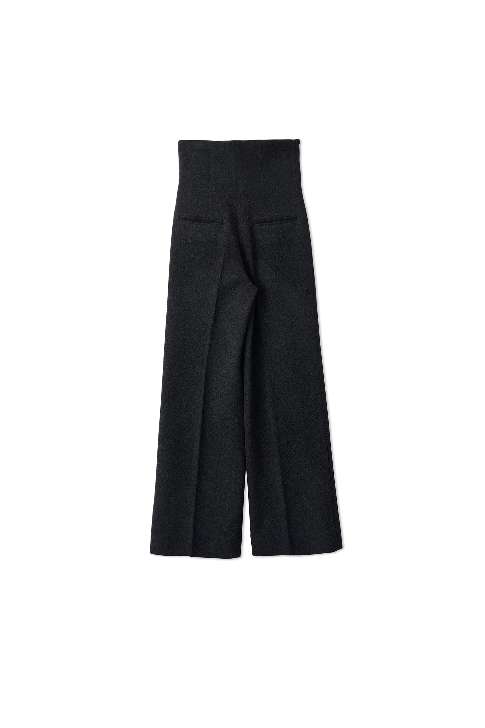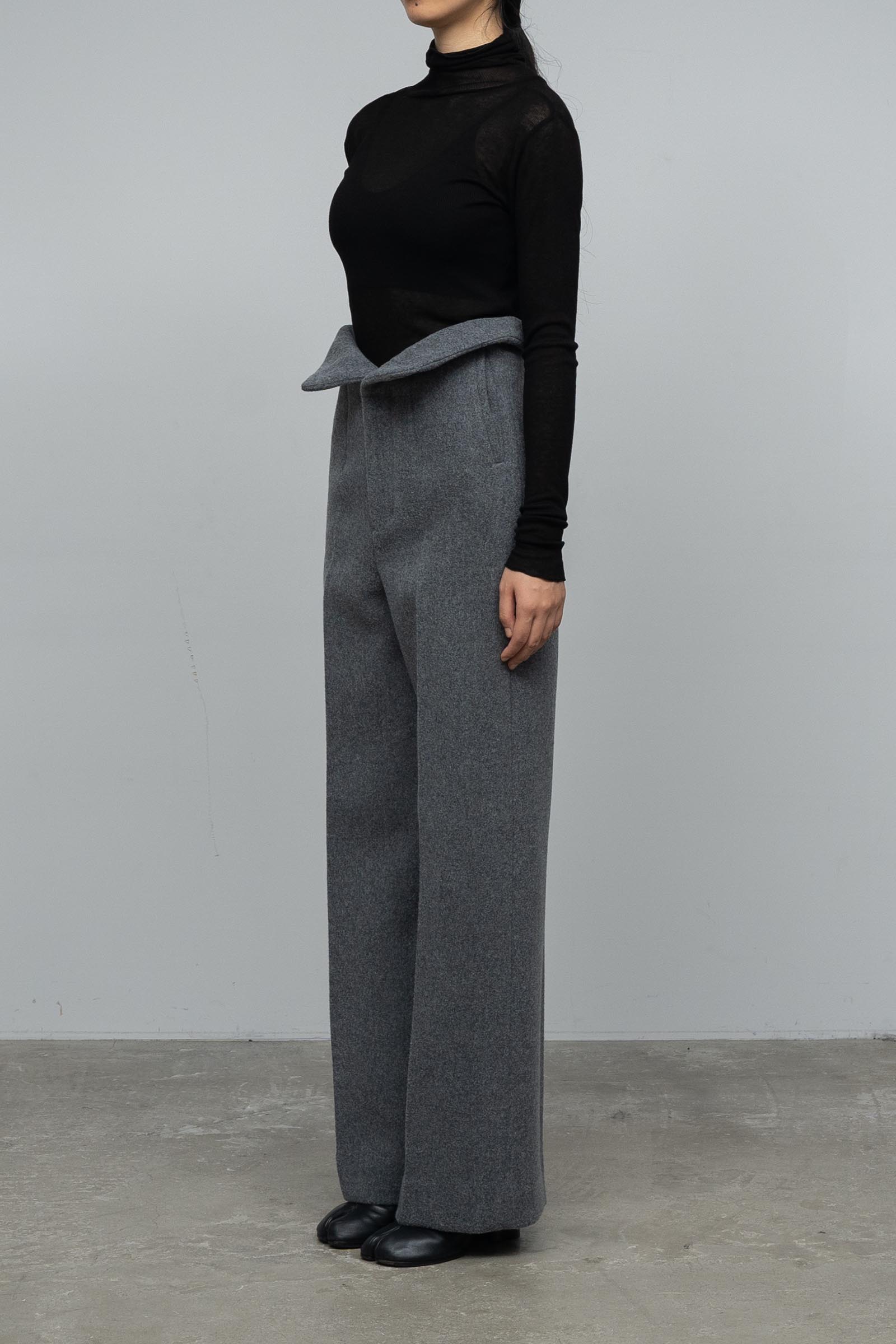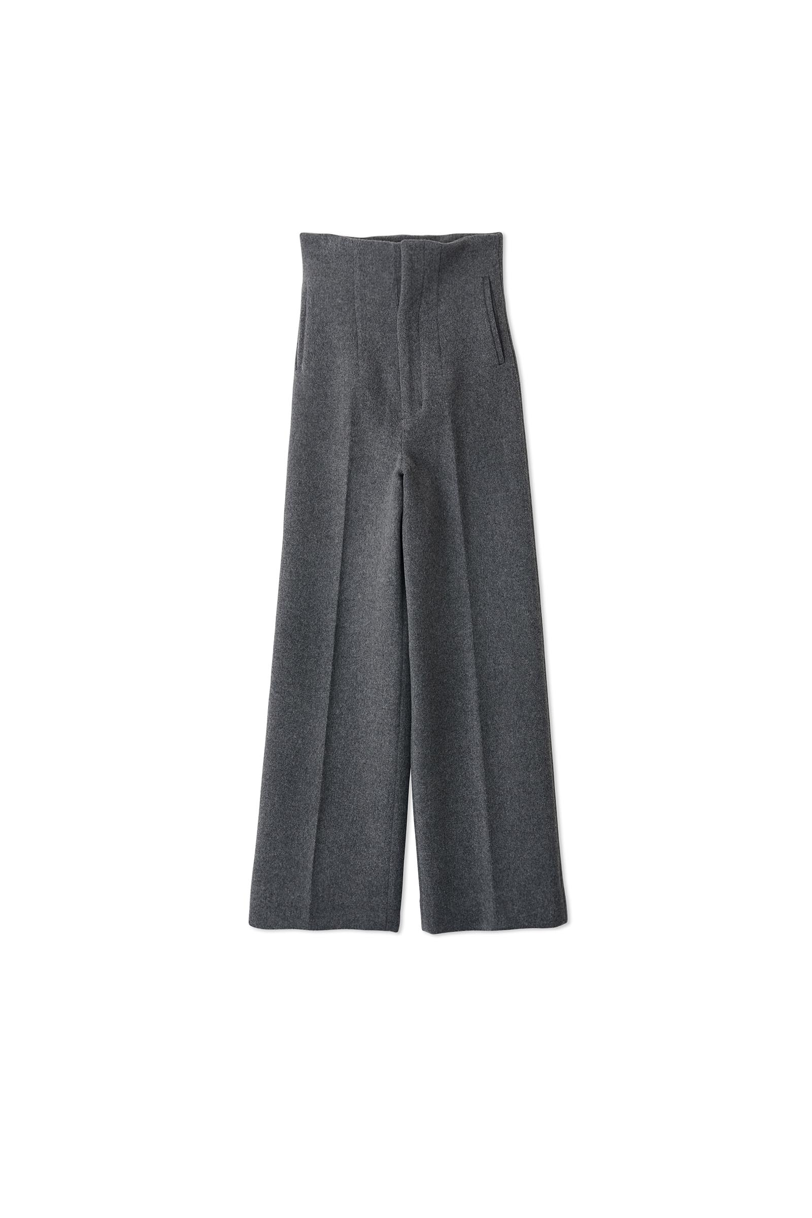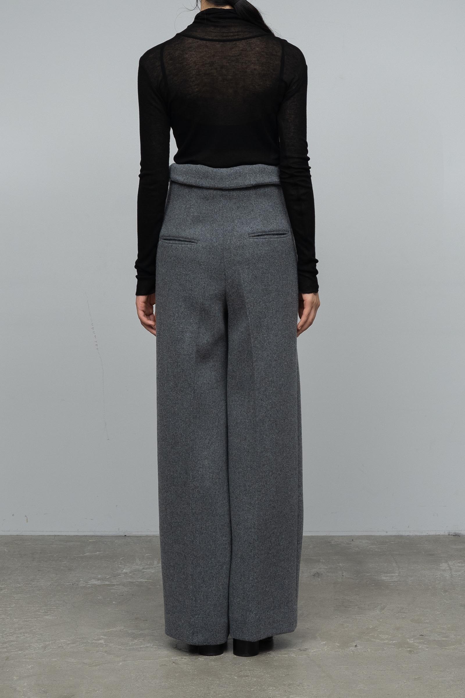 ダブルウール素材を使用したハイウエストパンツ。ウエストは折って着用も可能。シンプルでありながらブランドらしい雰囲気を出すことができる1本。