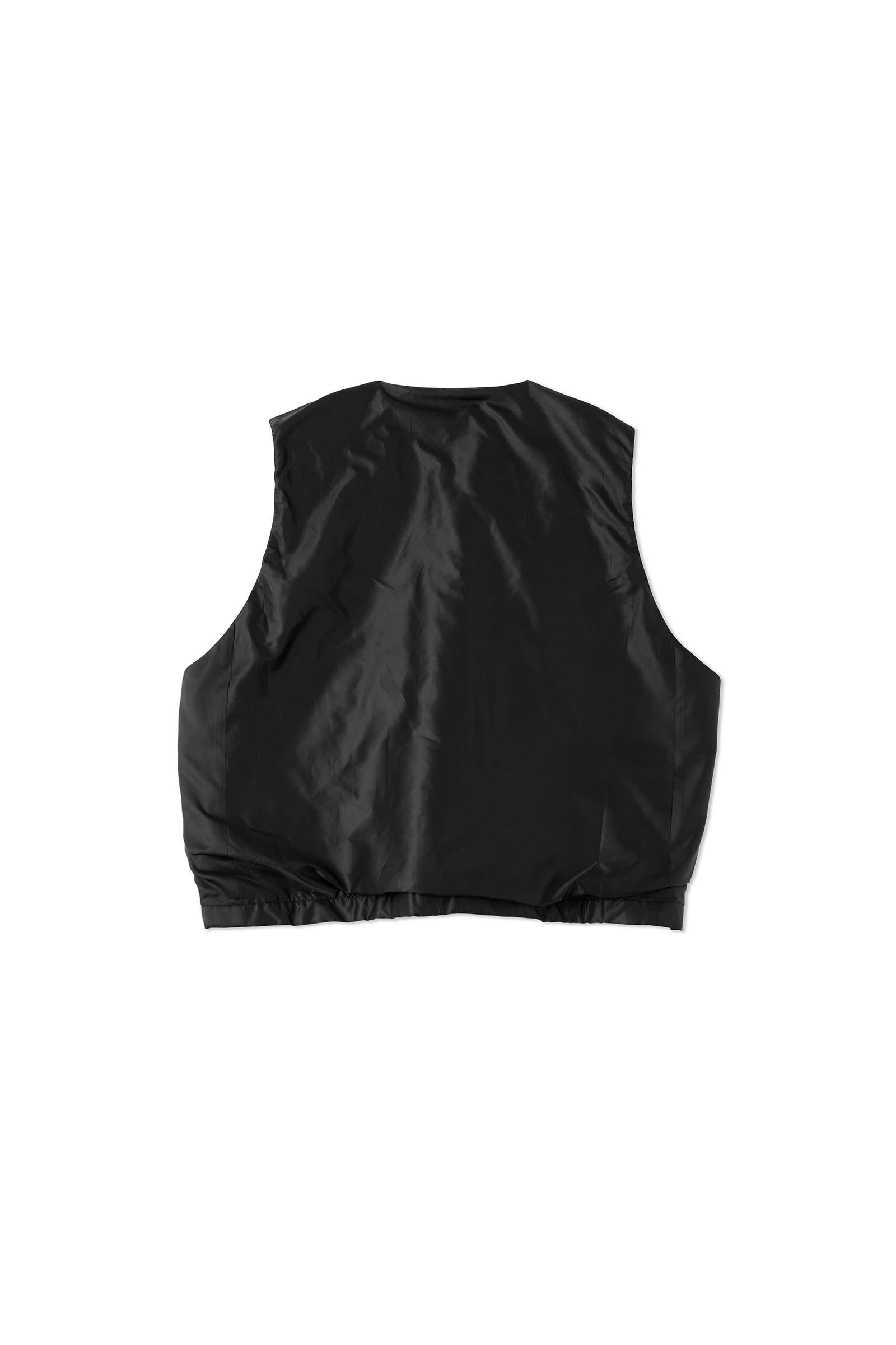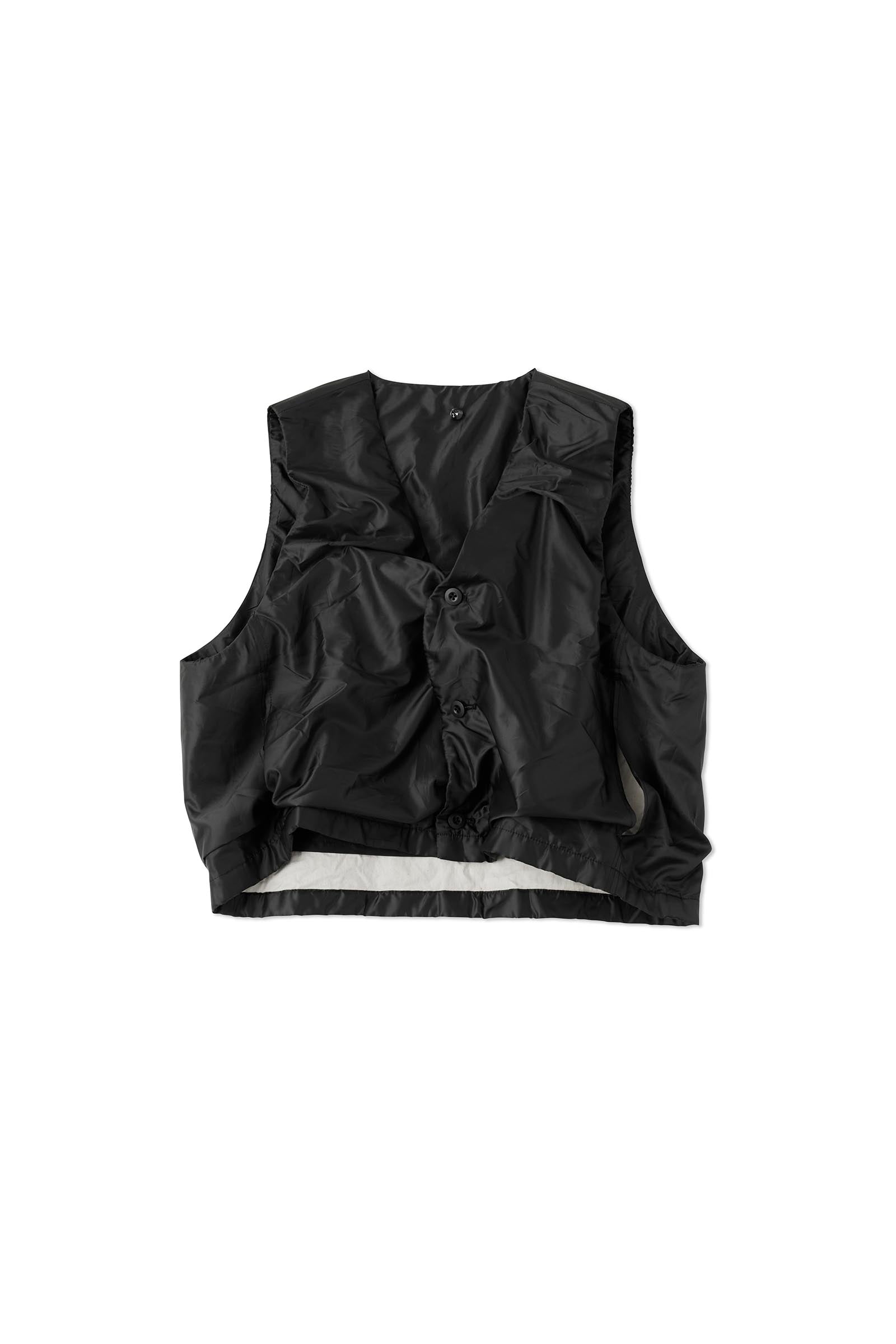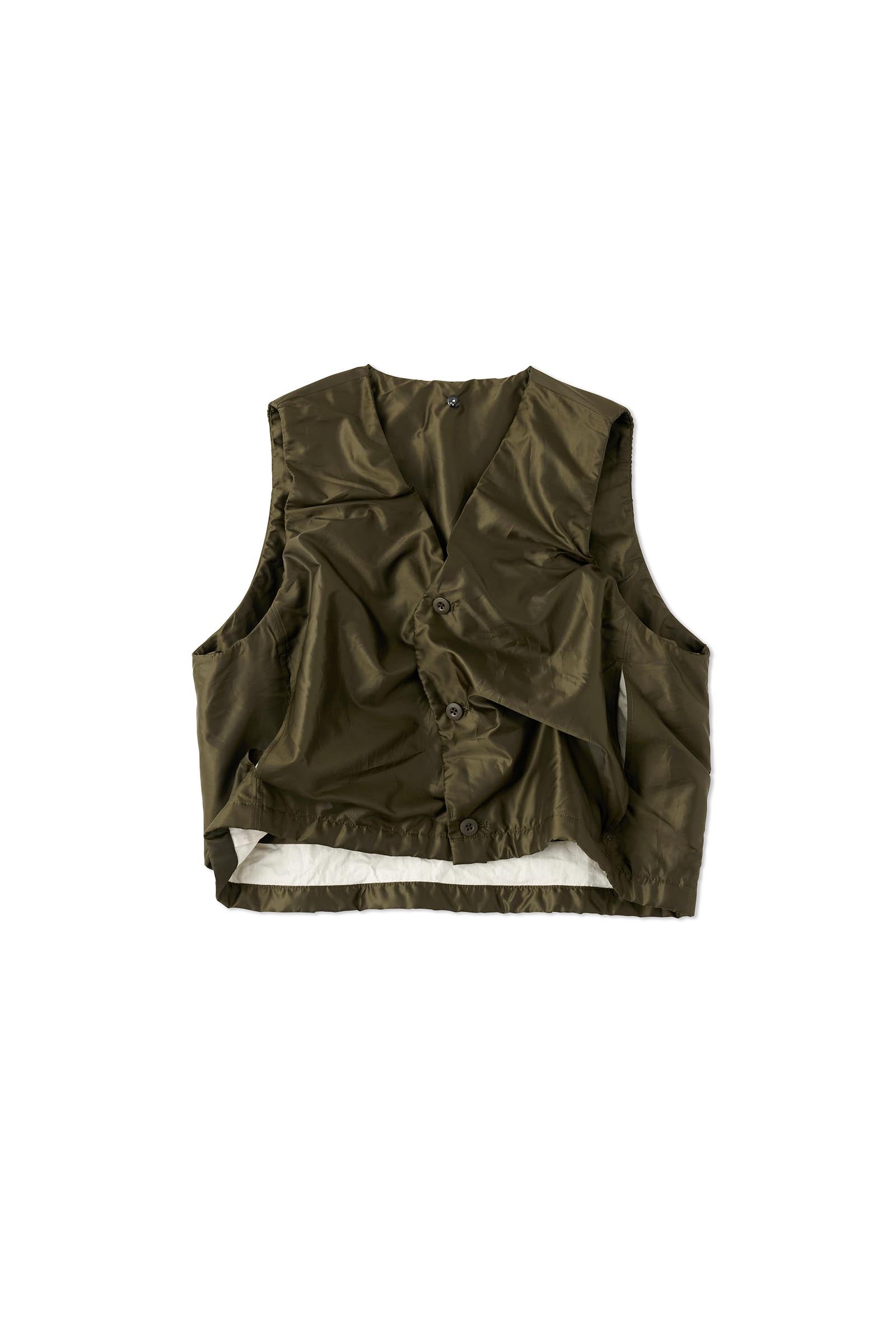サンプリング元は三層構造になっているUK軍防弾ベストの構造から発想したベスト。中層の生地をリベットで摘むことで、捻じ曲がったような見た目になっているのが印象的。