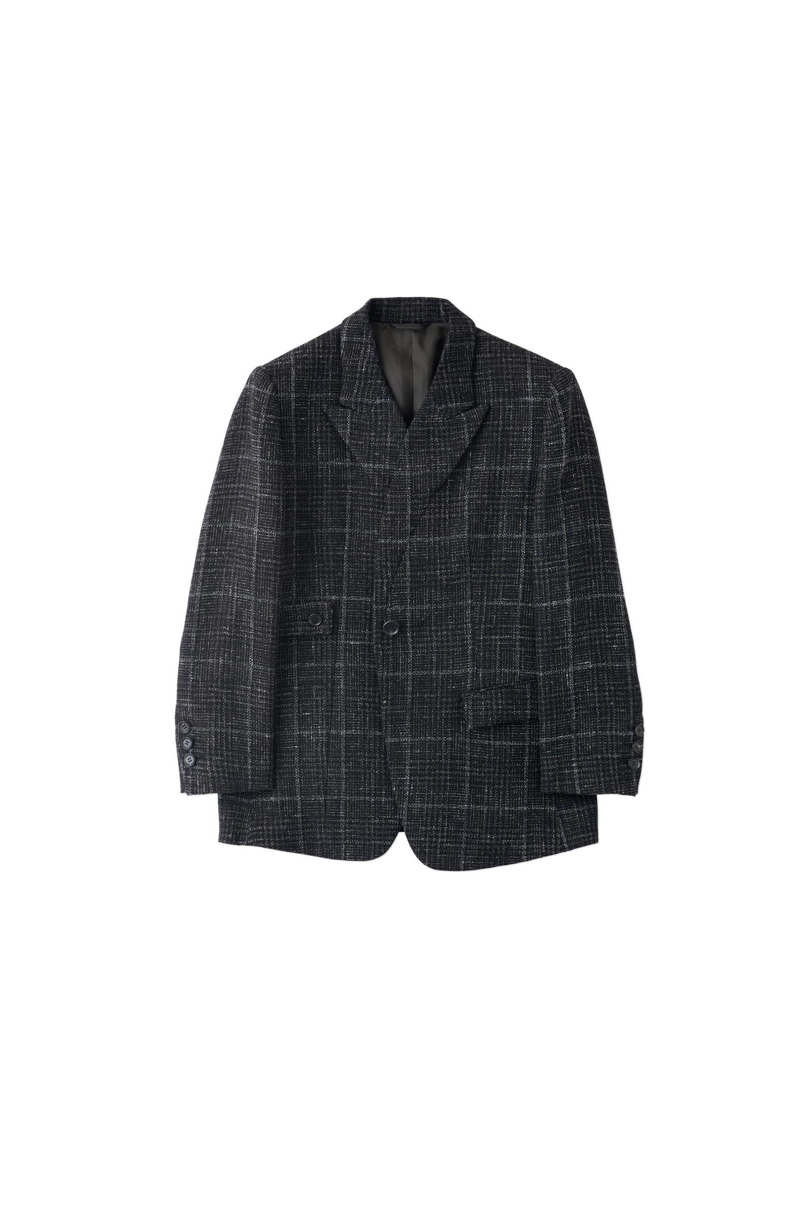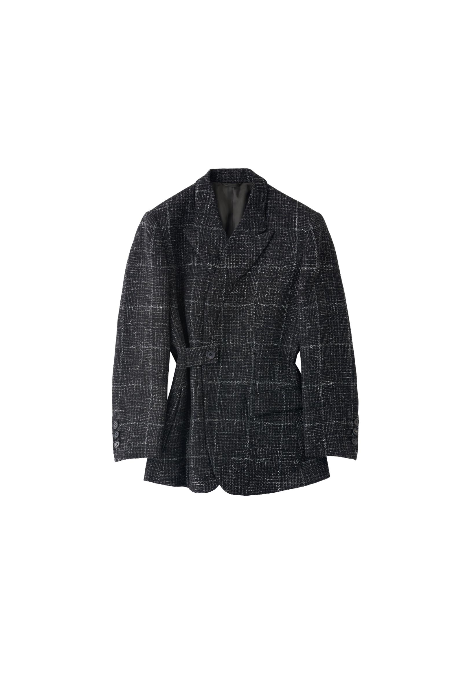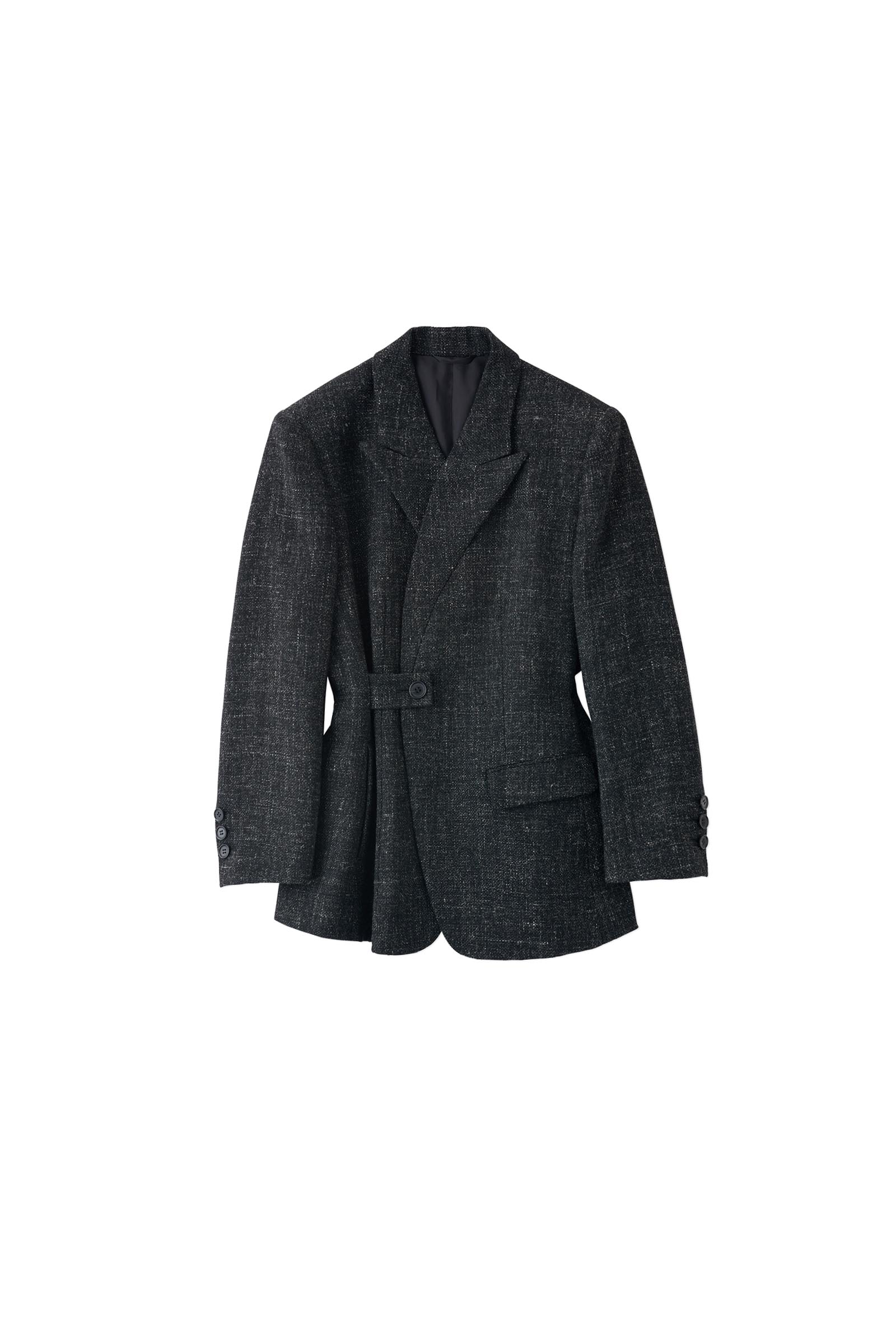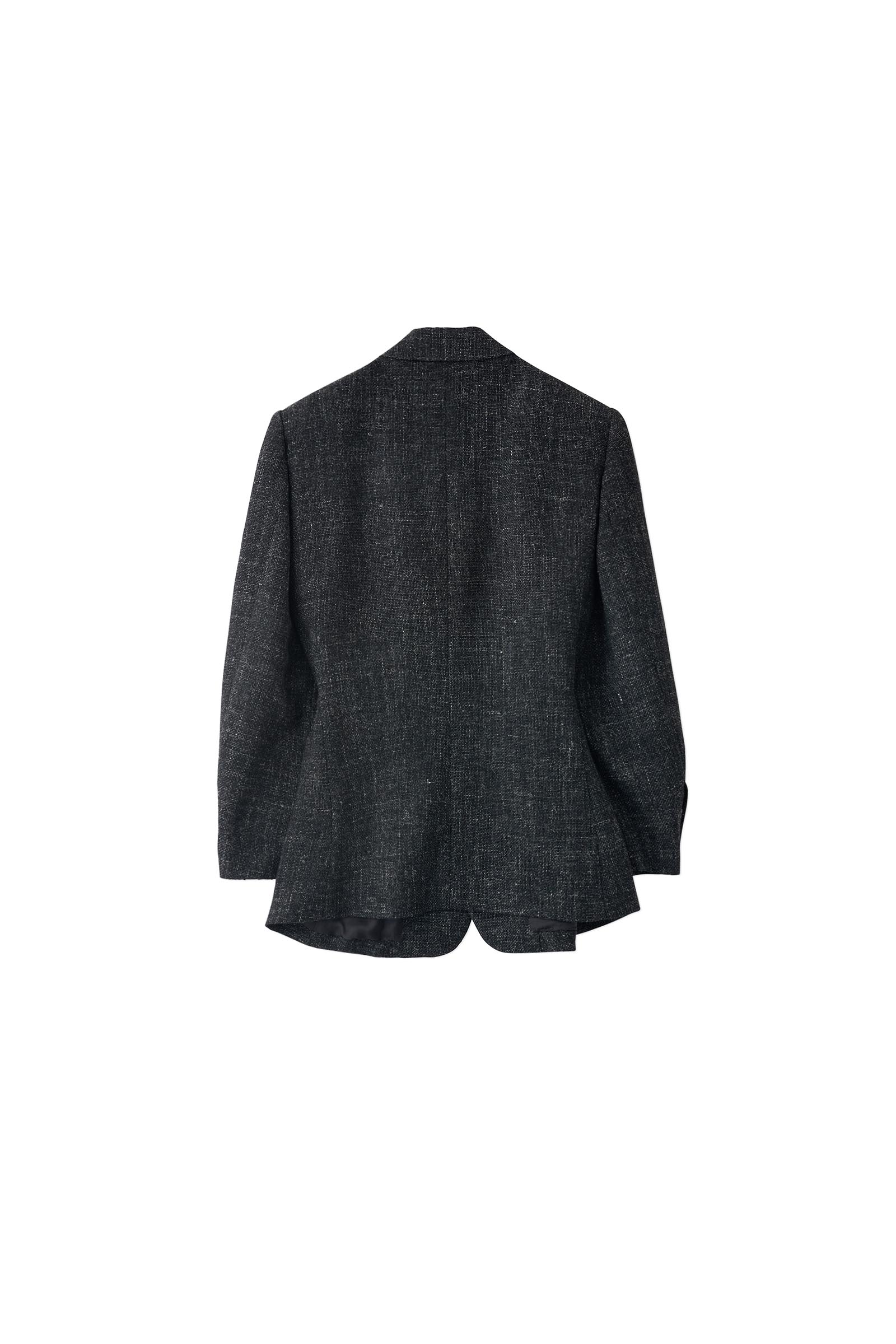 ボタンを閉めるとドレープの出るジャケット。 リネンウールの紡毛のラフな見た目に対してエアリーでしなやかなタッチを生かし、重くなりすぎない仕様に。肩まわりはシルエットをきっちりと作り、裾にかけては柔らかい雰囲気が印象的。