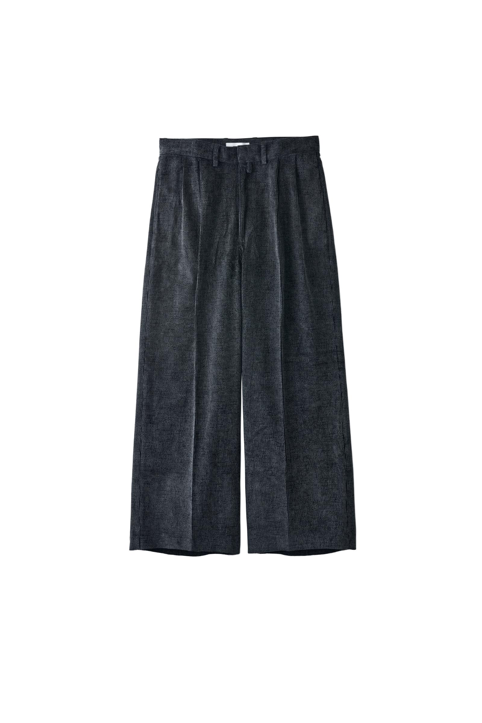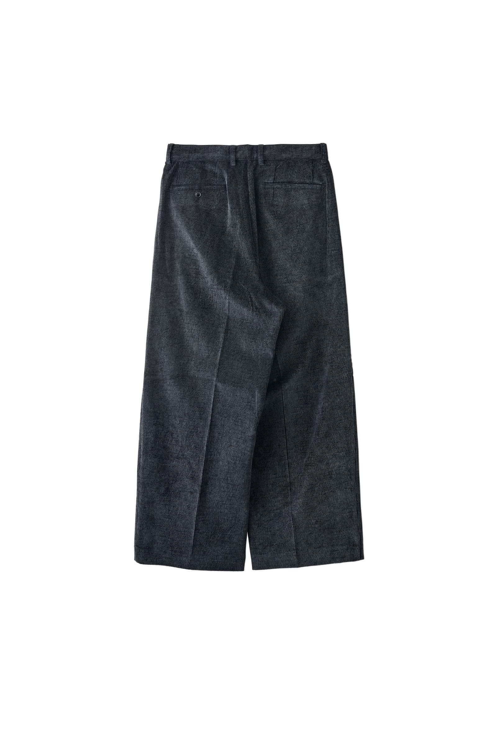 ブランド定番のゆとりのあるスラックストラウザーズ。ベルト内側にあるテープによってウエストサイズの調整が可能。生地は黒のコーディロイの抜染にすることで奥行きのある表情に仕上がっている。