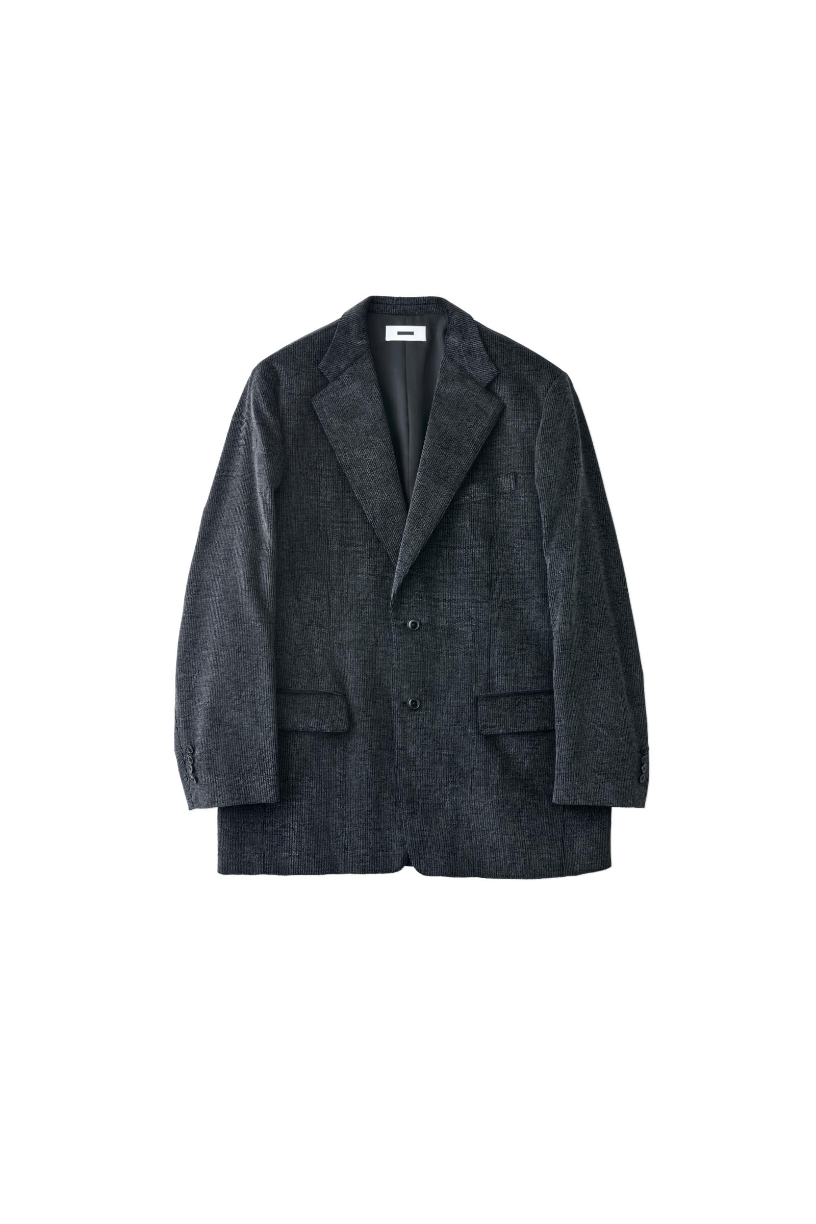 今期の新型のテーラードジャケット。身幅はゆったりしているものの肩はジャストにすることでテーラードジャケットと羽織の双方の要素を備えたジャケット。生地は黒のコーディロイの抜染にすることで奥行きのある表情に仕上がっている。
