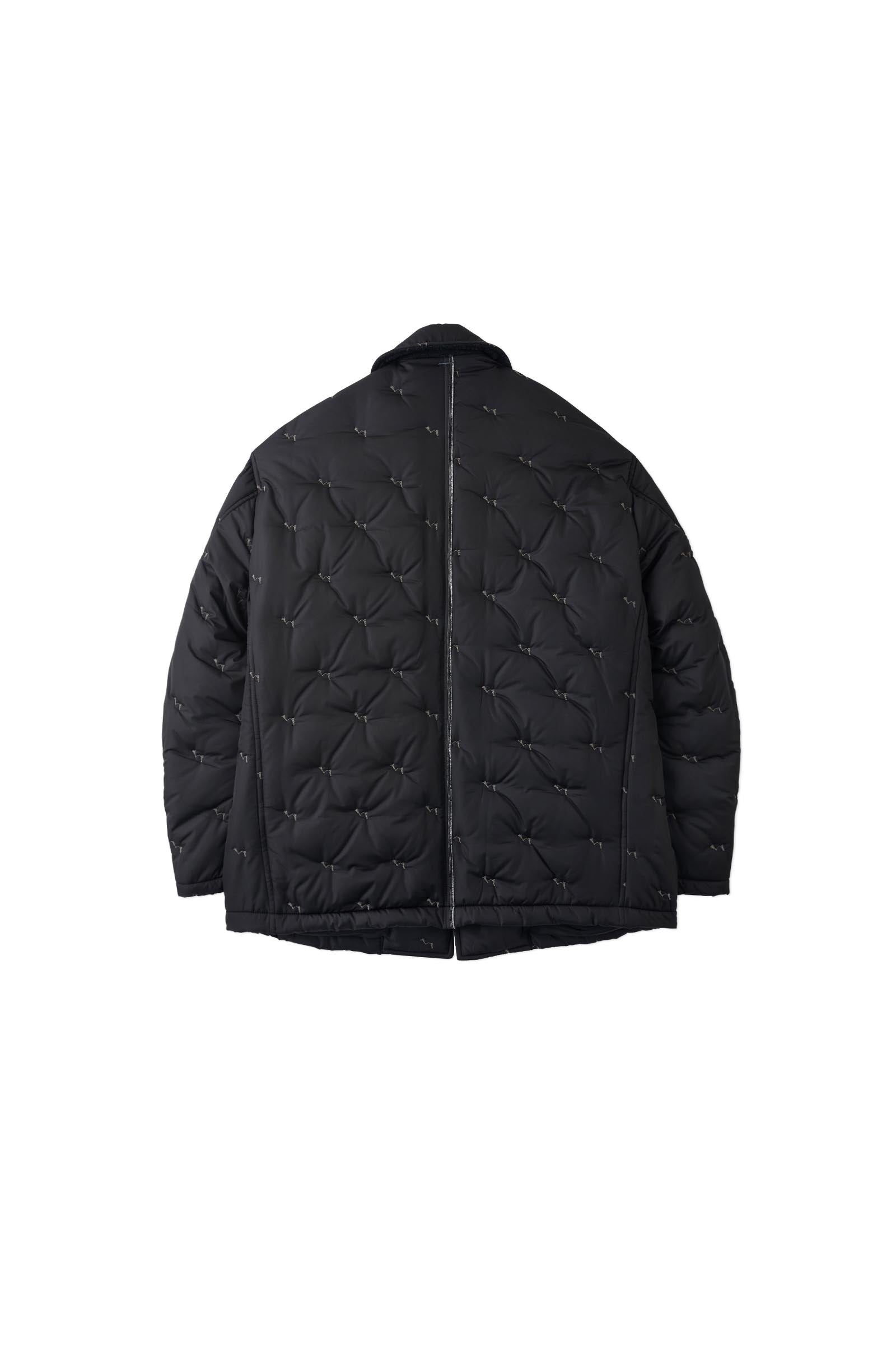 ペンギンの足跡と見立てた刺繍が施された中綿ジャケット。襟元のストラップは月を表現し、シーズンのテーマを凝縮させた主張しすぎないミニマルな一着。