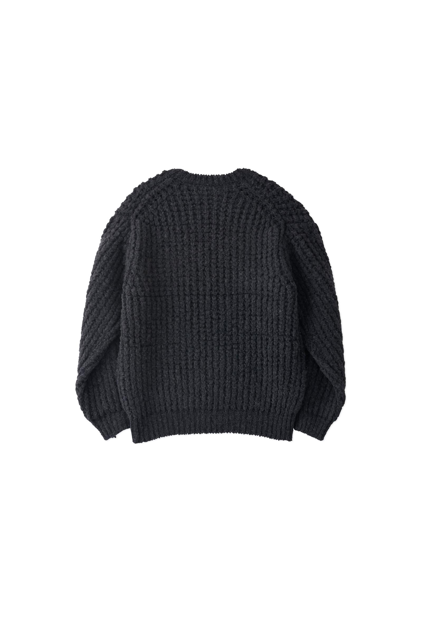ベビーアルパカのブークレーヤーンを使用したビックワッフル編みのクルーネックセーター。