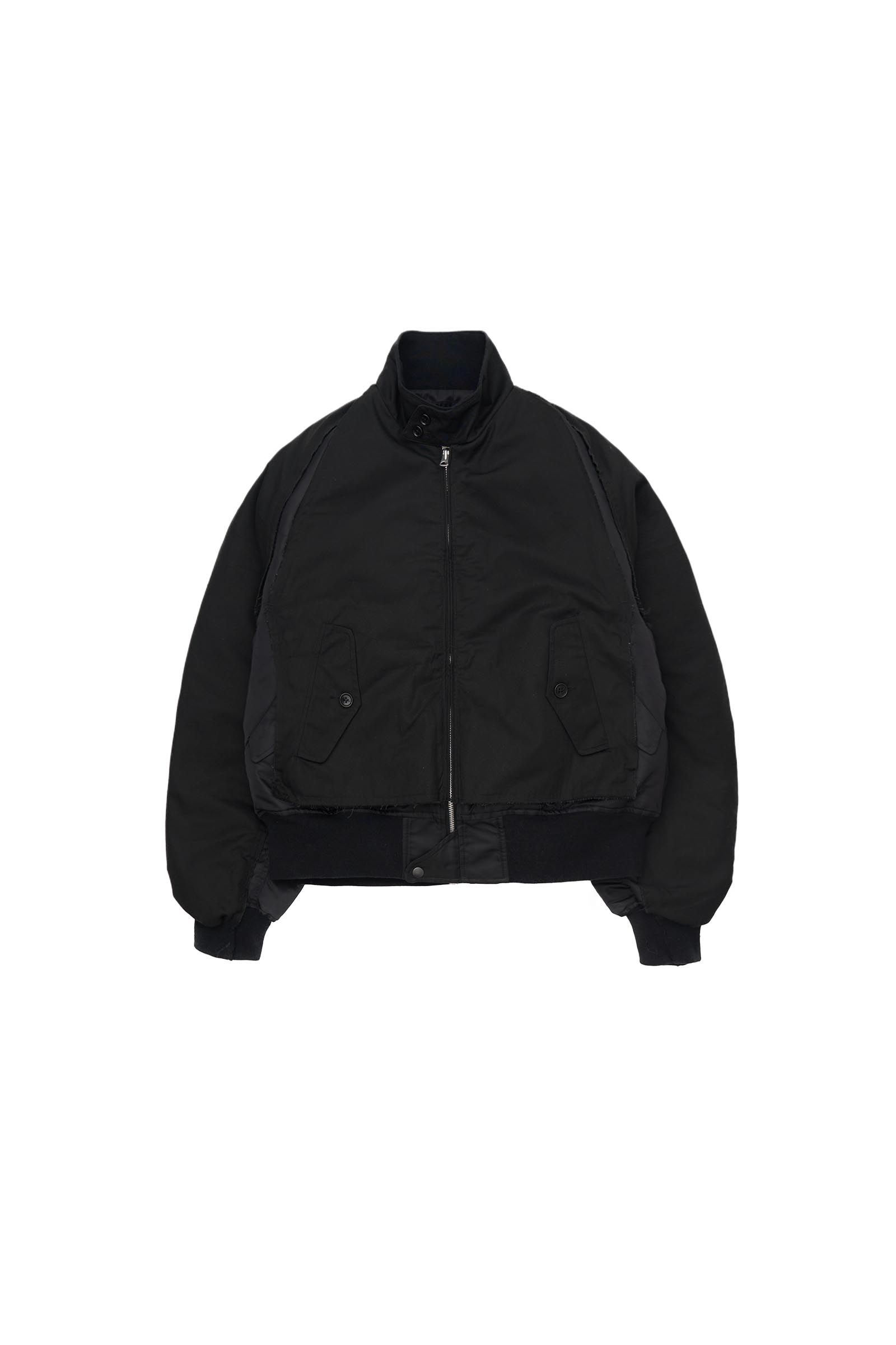 ハリントンジャケットの裾がカットされ袖と脇が解体された下にL-2Bをドッキングさせたドッキングブルゾン。マン・レイのシュールレアリスムのオブジェのインスピレーションから異なるアイテムの組み合せを構築したデザインに。表地にコットンツイル、別布に撥水加工のナイロンツイルを使用。