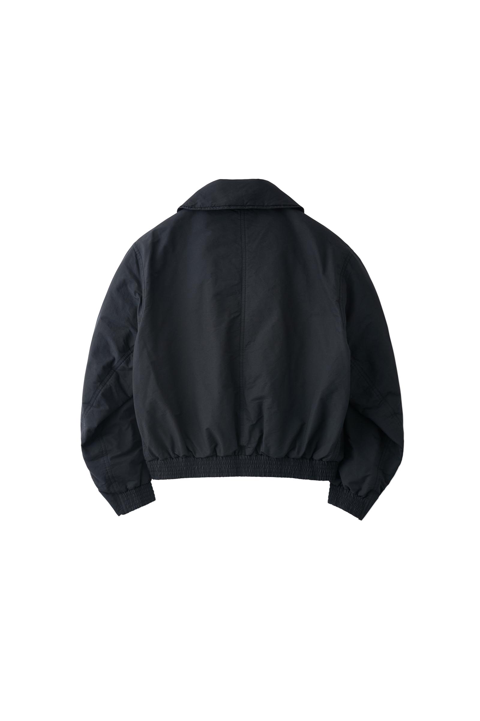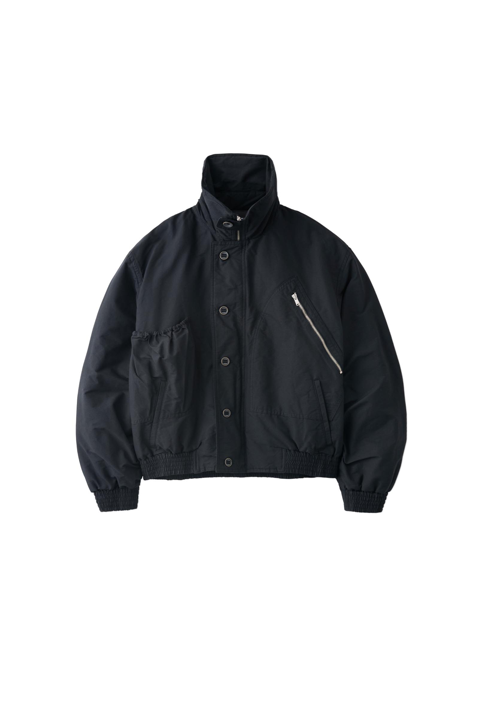 "KATHARINE HAMNETT" とのコラボレーションモデルのショートブルゾン。80'sのアーカイブアイテムから両胸ポケットのディテールに惹かれて作成。大きなスタンド衿、大きなファスナーパッチ胸ポケット、ゴム入りのギャザーポケットなども魅力です。袖口と裾は平ゴムで絞っている。またインラインではなかった腰ポケットを追加しました。裏地にもオーガニックコットンを使用。