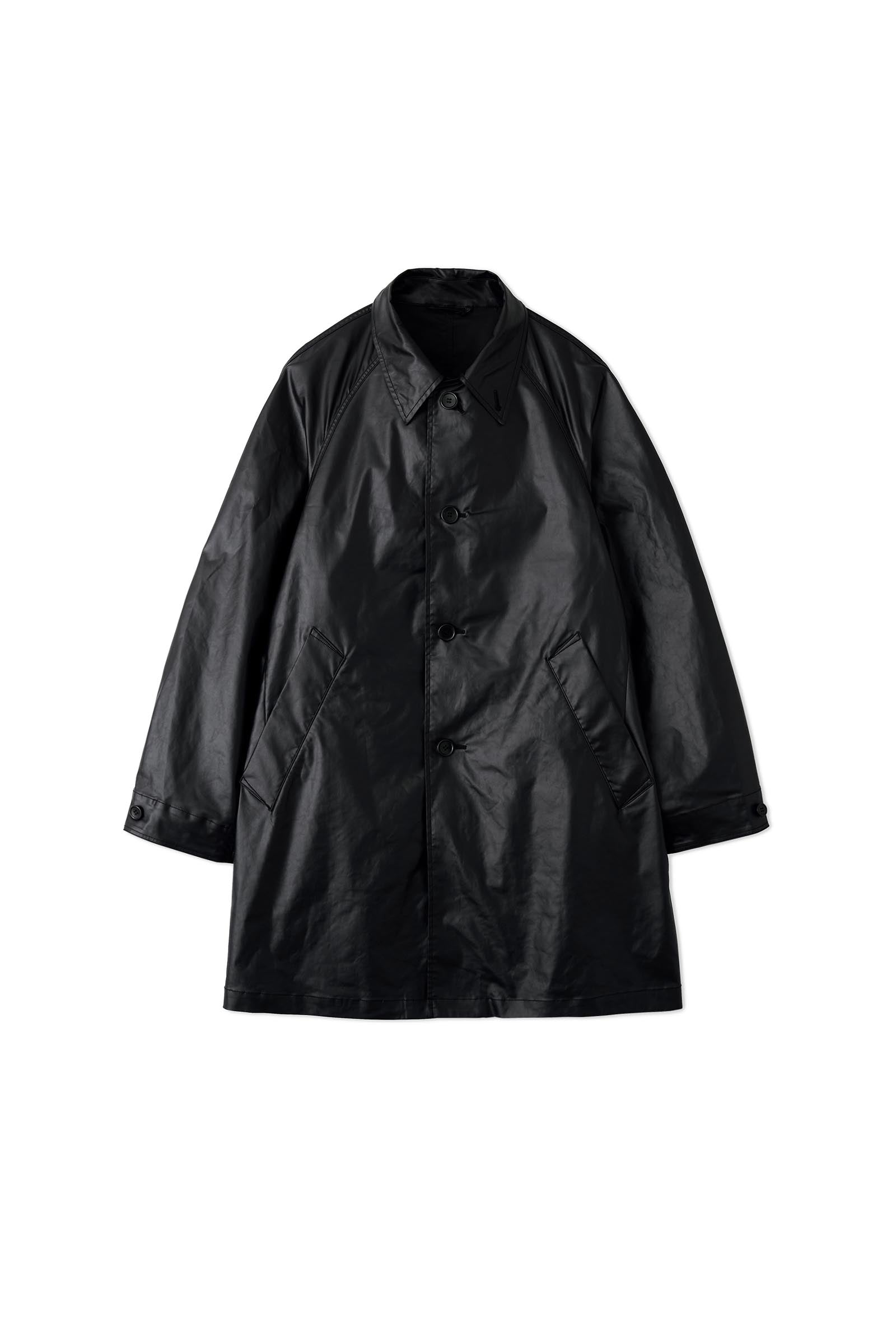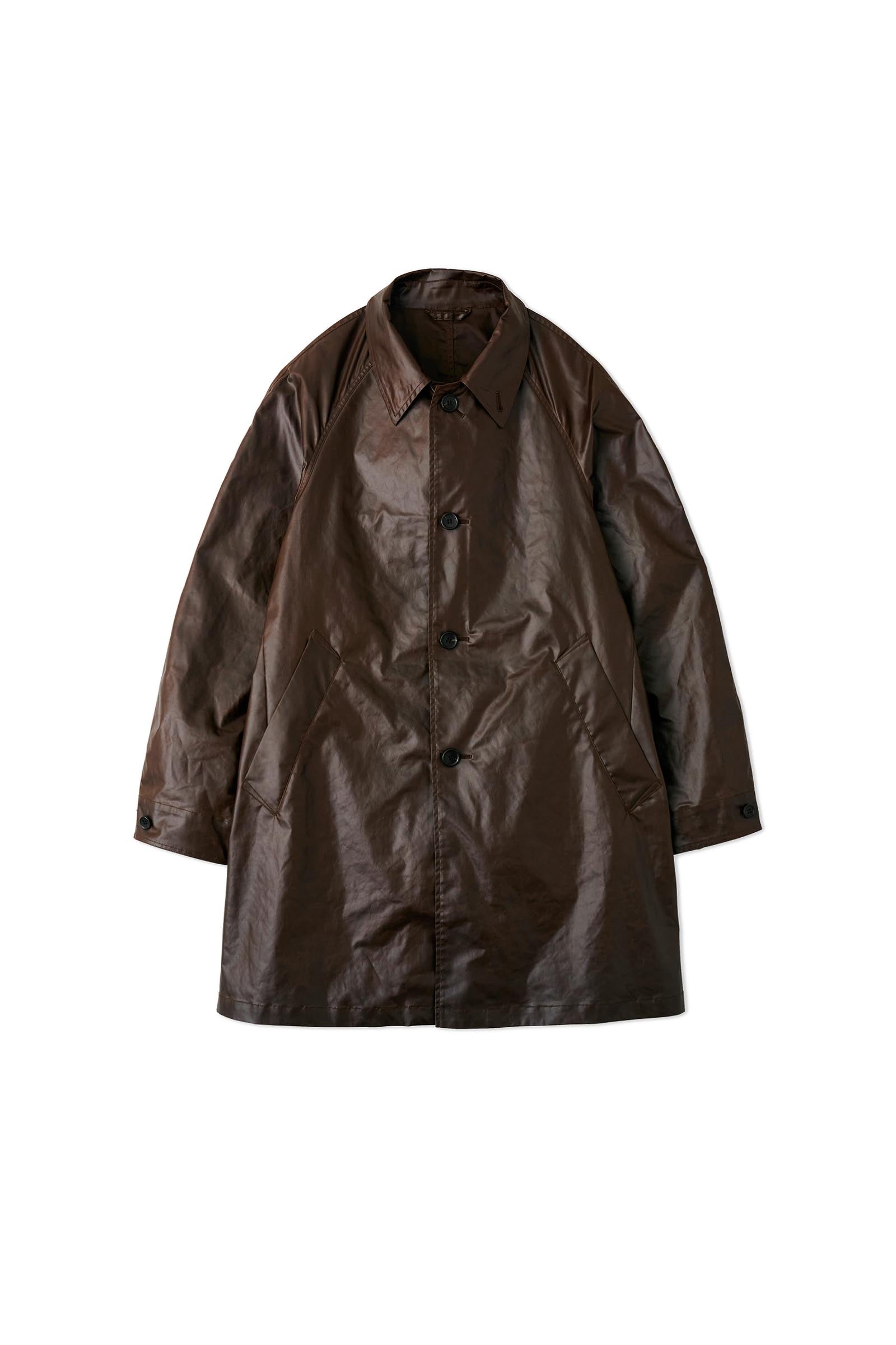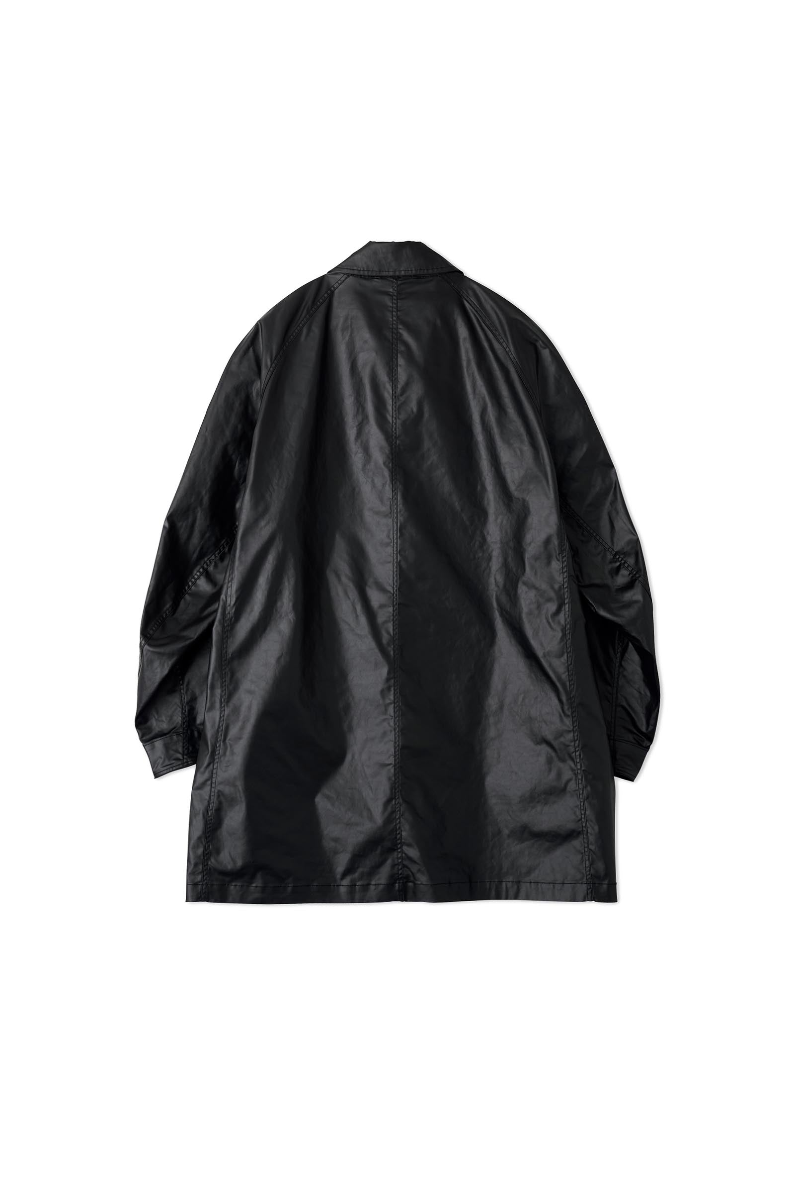 24SSのレザーハーフコートのパターンをベースに、一重のカーコートにマイナーチェンジしたアイテム。経糸にはリサイクルハイカウント糸を使用したストレッチツイル素材を使用。その生地に小松マテーレのテクノビンテージーWXを付与し、ワックスをコーティングしたかのような、その独特な見た目と風合いは他に類をみないポリエステル素材。撥水加工、また、特殊な光沢加工技術とビンテージ繊意加工の組み合わせによりWAX調のあでやかな仕上がりが特徴。